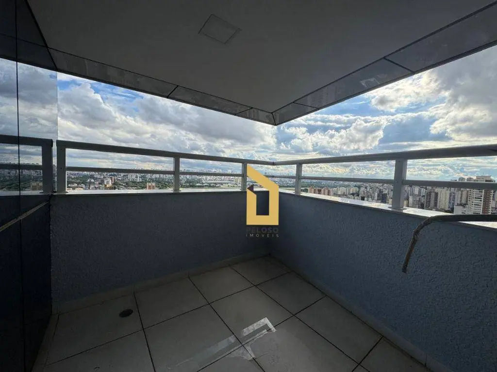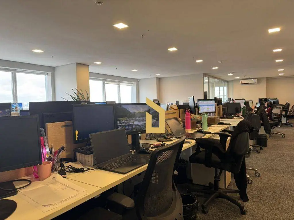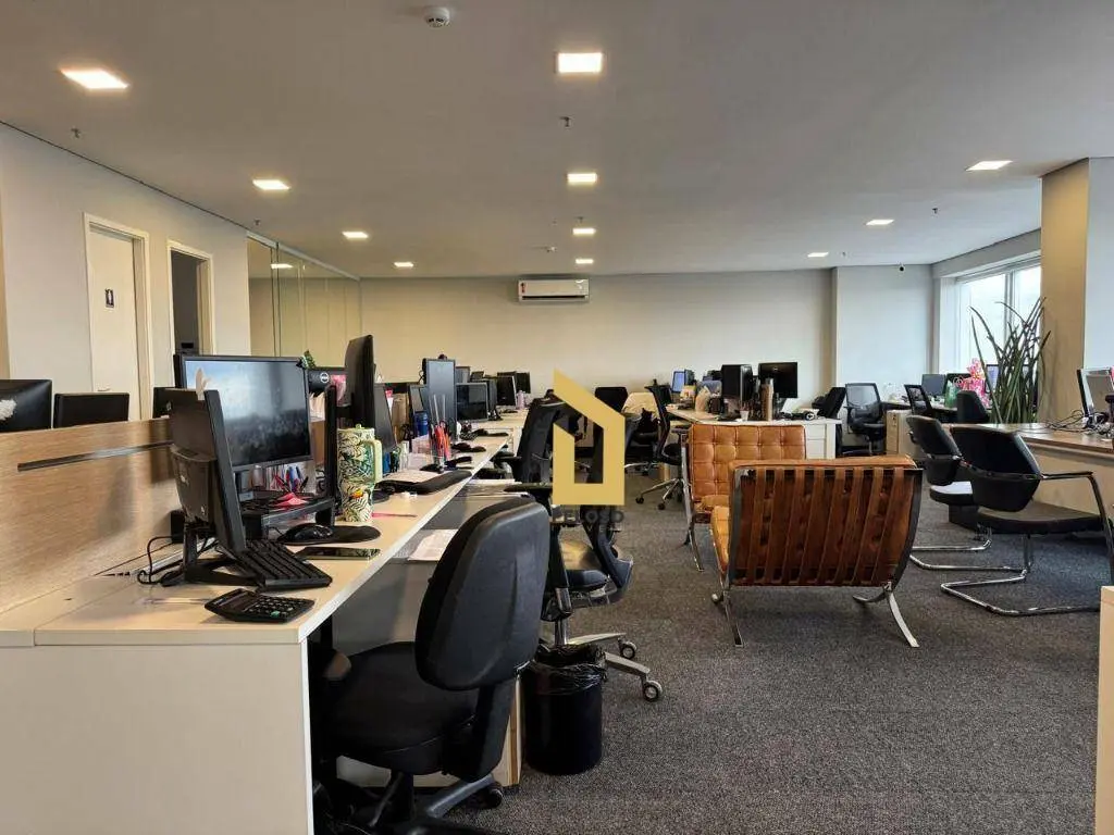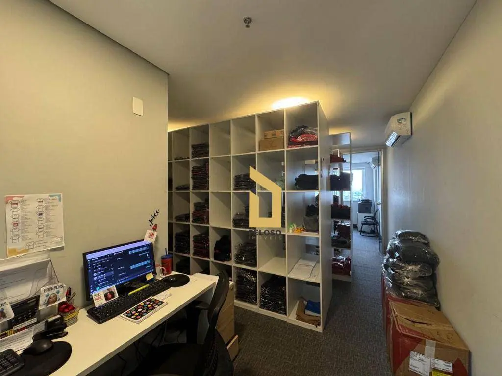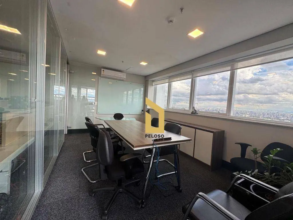 4 salas interligadas com copa, 5 banheiros, 2 varandas, piso elevado, teto, iluminação, ar-condicionado e mobília.