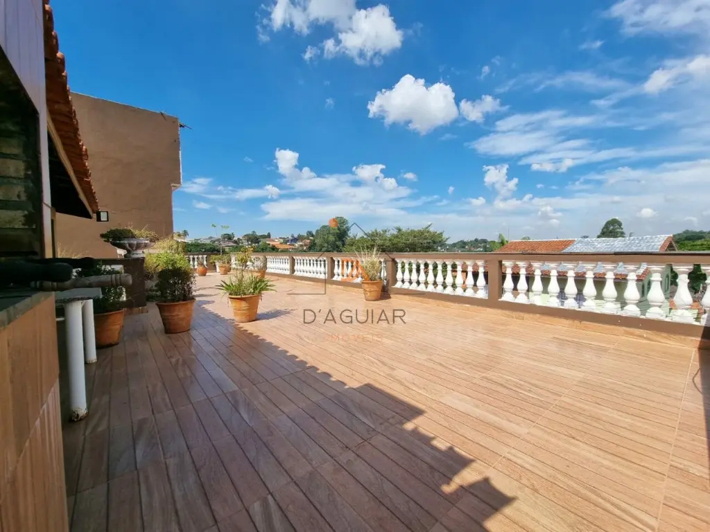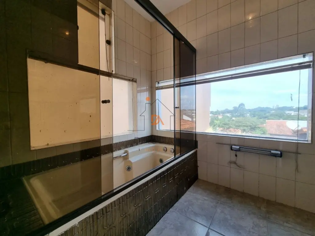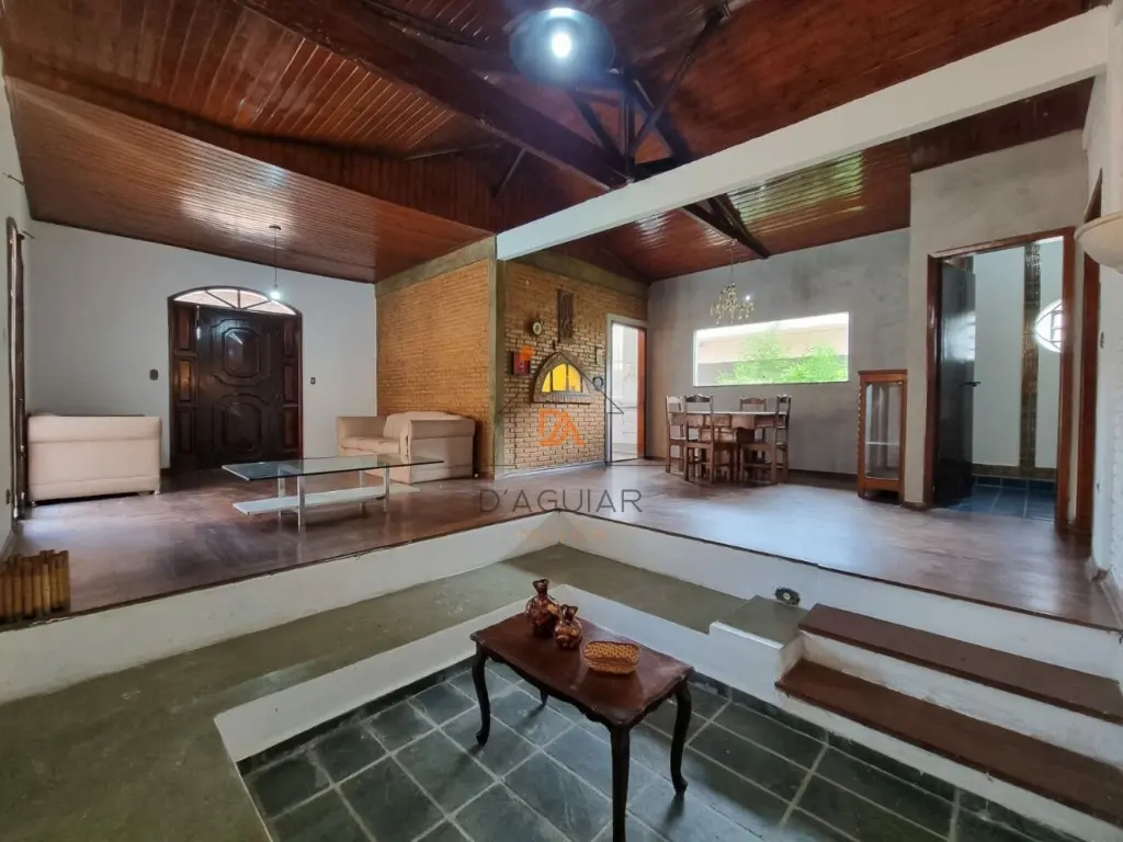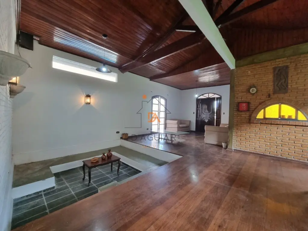 Imóvel diferenciado, amplo e versátil, com excelente estrutura para moradia familiar ou instalação de empresa. O sobrado principal conta com 3 salas amplas com piso em tábua corrida, teto aparente com acabamento em madeira, sala de lareira rebaixada com sofá em alvenaria e janelas com vidros blindados. Possui sala de refeições com jardim cortina viva, passa-prato com vitral, lavabo com detalhes banhados a ouro, cozinha planejada e área de serviço.