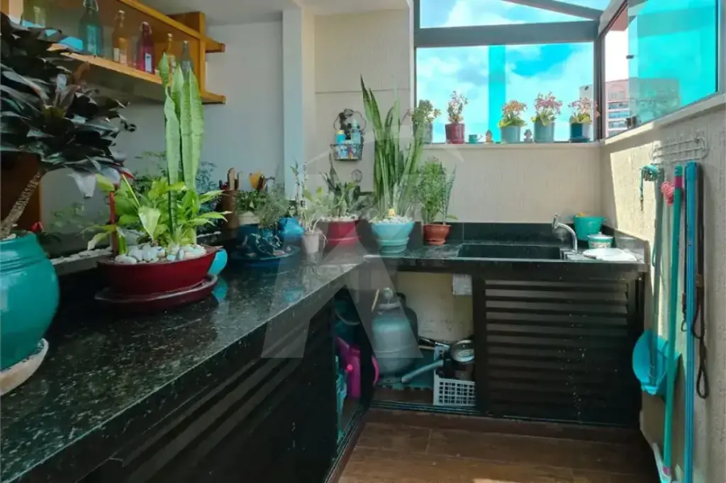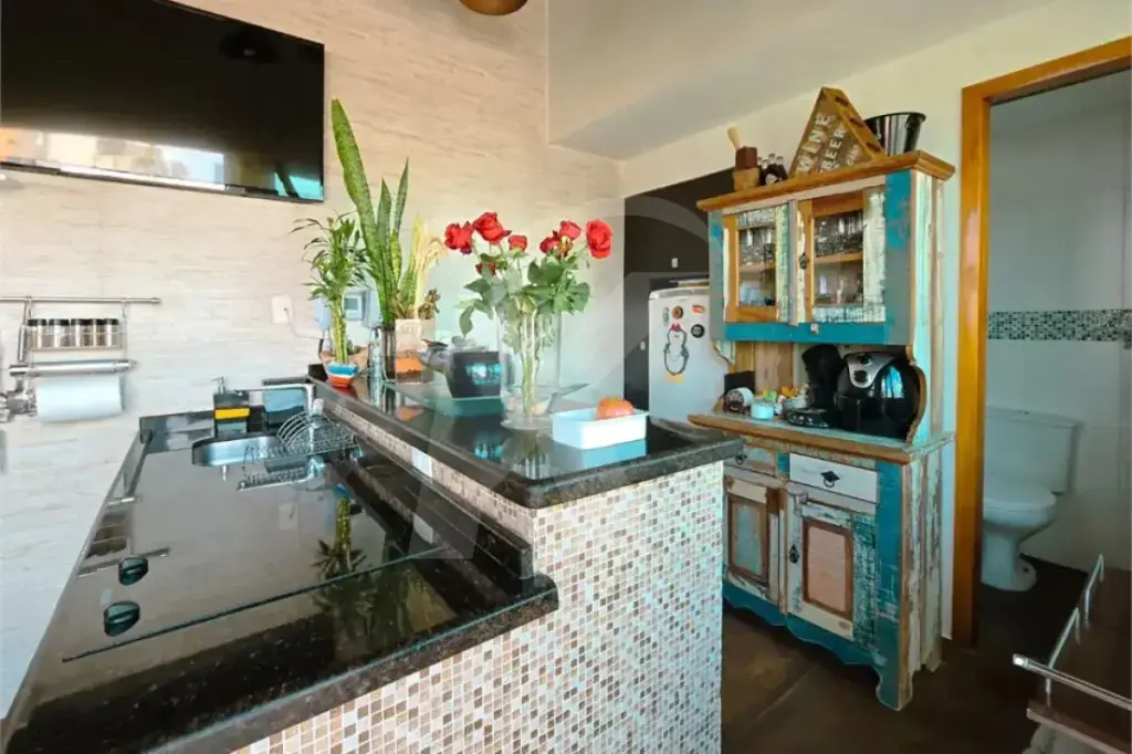 A cozinha é ampla e funcional, equipada com ilha central e armários planejados, facilitando a rotina diária. Ao lado, encontra-se a área de serviço com dependência e banheiro.