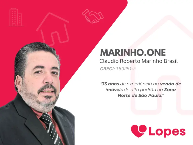 Marinho é corretor com mais de 35 anos de experiência na venda de imóveis de alto padrão na Zona Norte de São Paulo. Integra o time da Imobiliária Lopes - uma das mais renomadas de São Paulo. É especialista em: