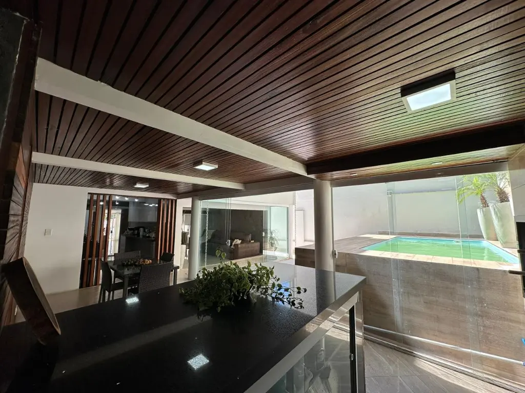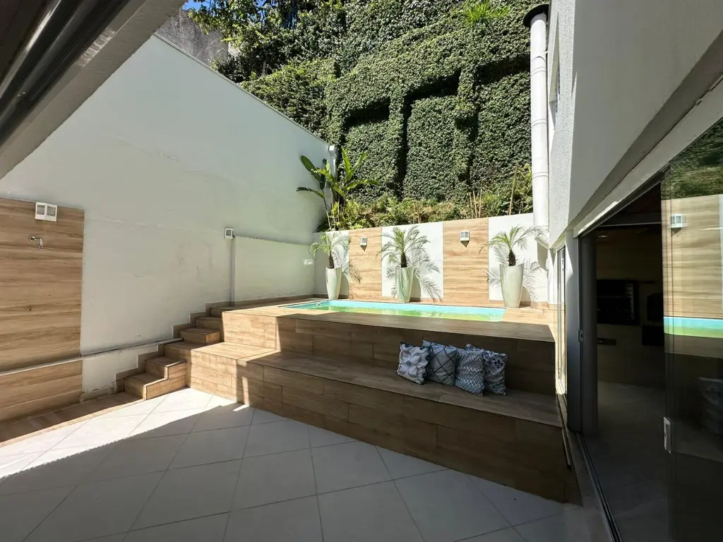 Quintal amplo com varanda, corredor lateral e piscina nos fundos;