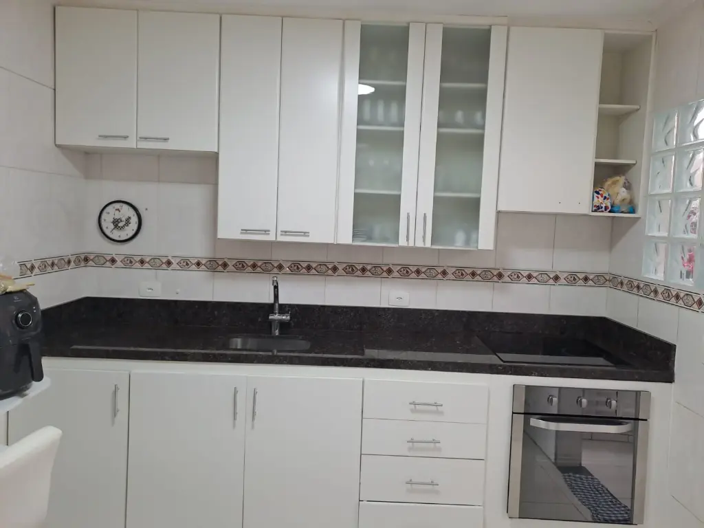 Cozinha equipada com armários planejados, cooktop, forno embutido, mesa com painel e teto em gesso com luminárias, pronta para inspirar seus melhores momentos culinários.