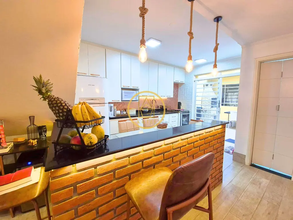Logo na entrada, você encontra uma sala de estar aconchegante e renovada, integrada a uma cozinha modernizada, criando um ambiente prático e agradável para receber amigos e familiares.