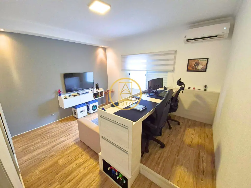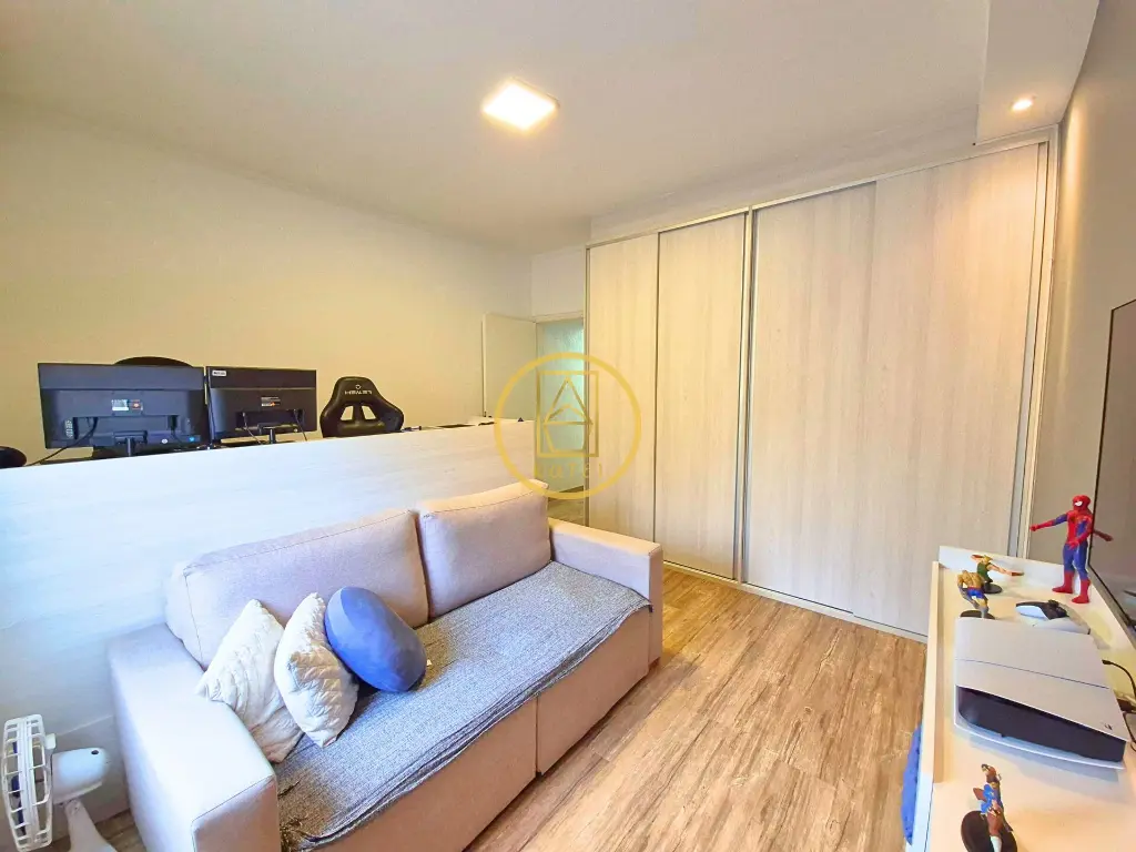 O dormitório principal conta com closet, trazendo mais organização e praticidade, enquanto o segundo dormitório foi inteligentemente adaptado para uma sala de jogos e escritório, ideal para quem trabalha em casa ou busca um espaço multifuncional.
