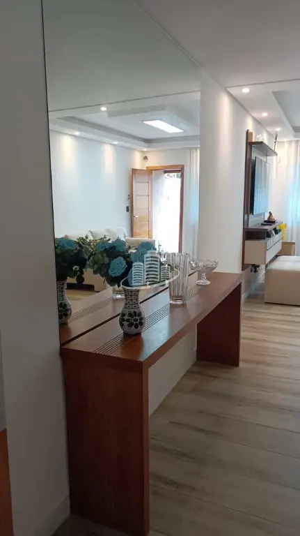 A sala é ampla e conta com espelho de parede inteira, que valoriza o ambiente e traz sensação de maior espaço e sofisticação.