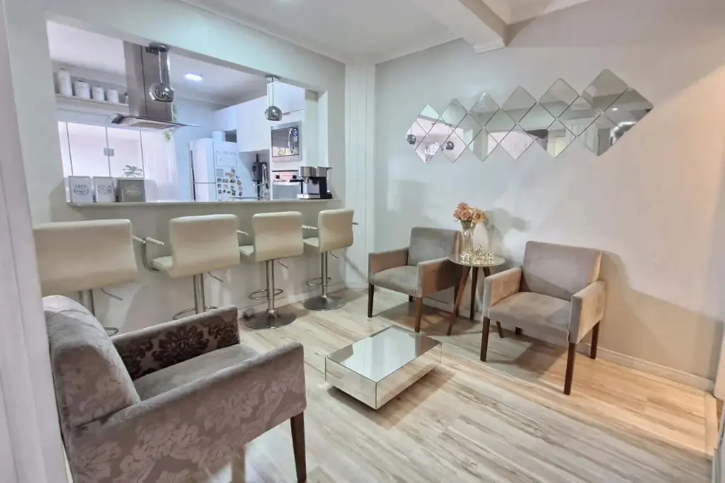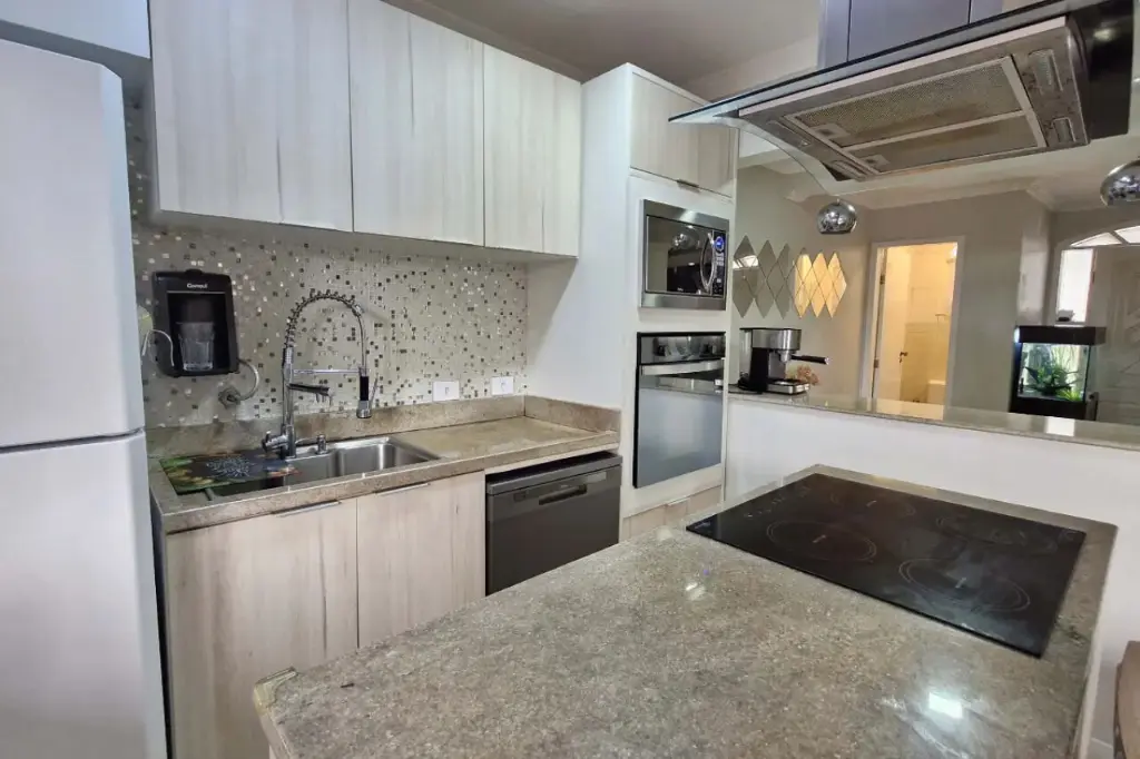 Possui 3 dormitórios (sendo 1 suíte), banheiro social e lavabo, sala de estar e jantar integradas, além de cozinha planejada com armários embutidos. A área externa conta com espaço gourmet, quintal ventilado, sacada com vista livre e garagem privativa.