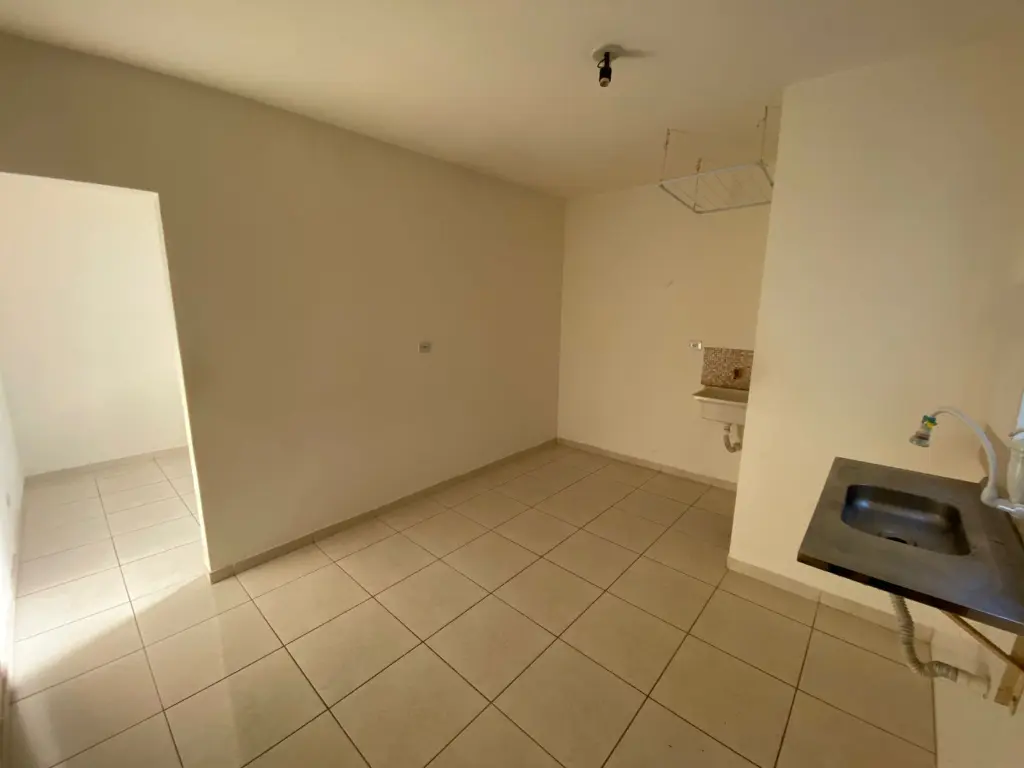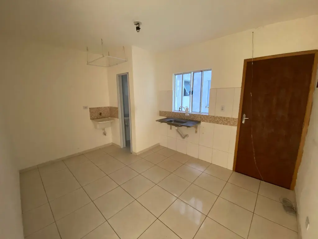 apartamento em condomínio possuindo 1 dormitório, cozinha, banheiro e área de serviço.