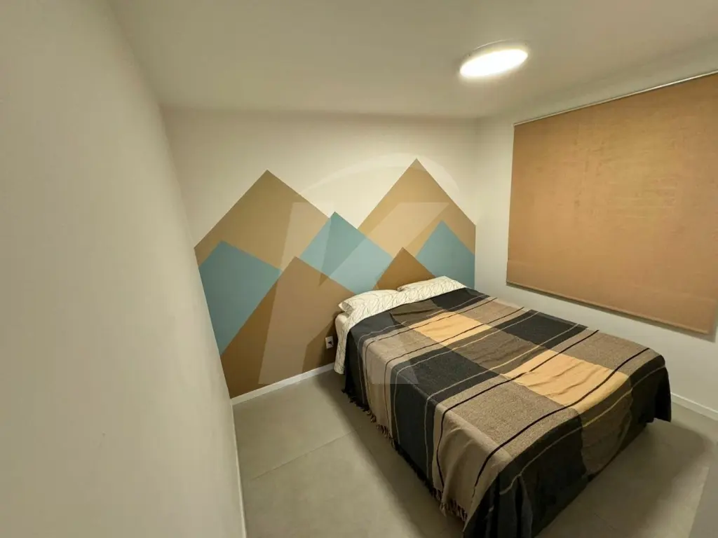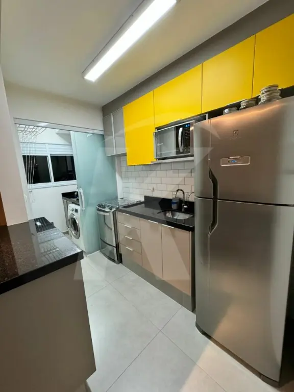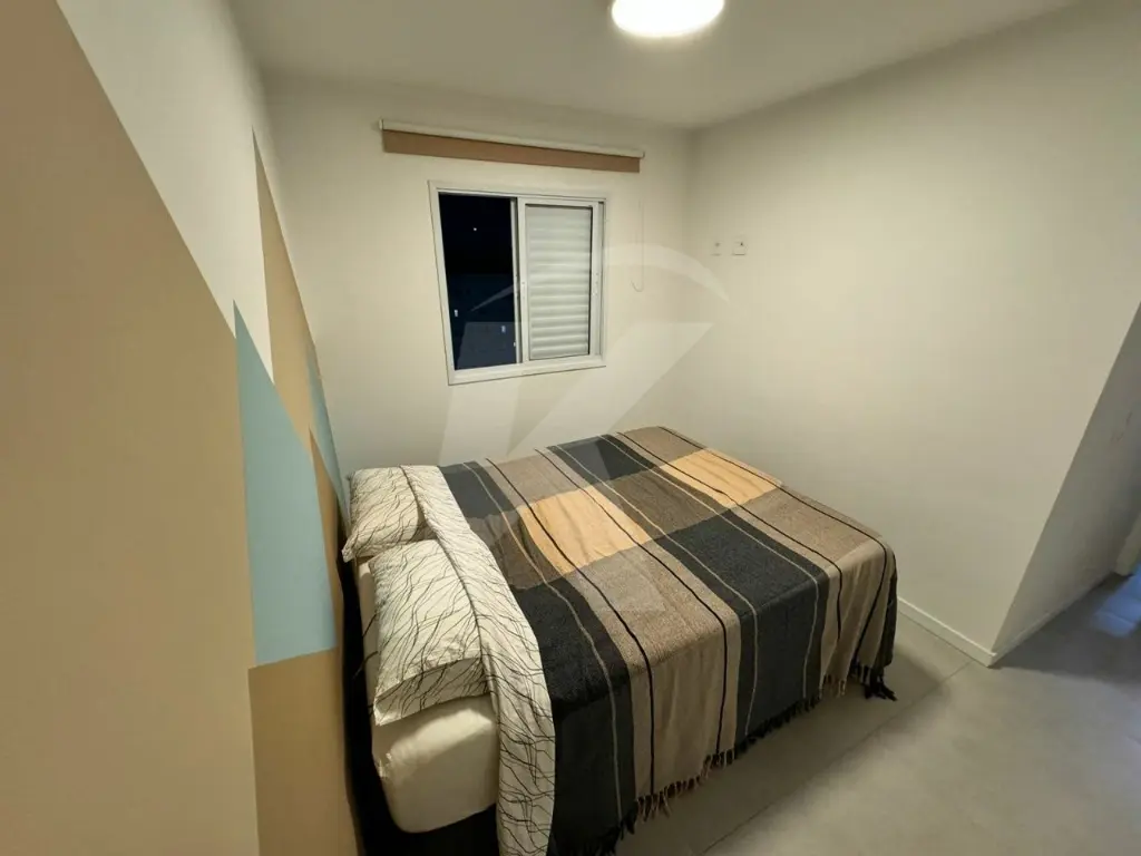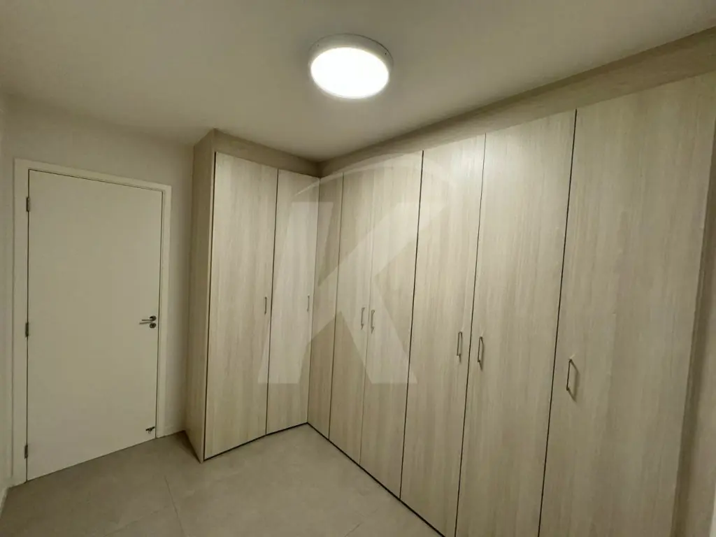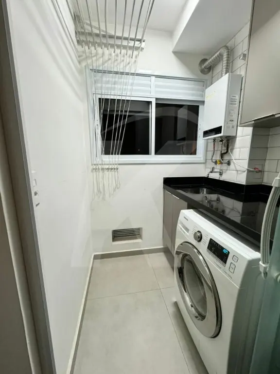 O apartamento possui 2 dormitórios (sendo 1 com armários), sala com painel e cortinas, cozinha equipada com armários e filtro de água, lavanderia com ventilação natural e armários, e banheiro com chuveiro a gás. Para vaga de estacionamento livre e fixa (não rotativa) há taxa extra.