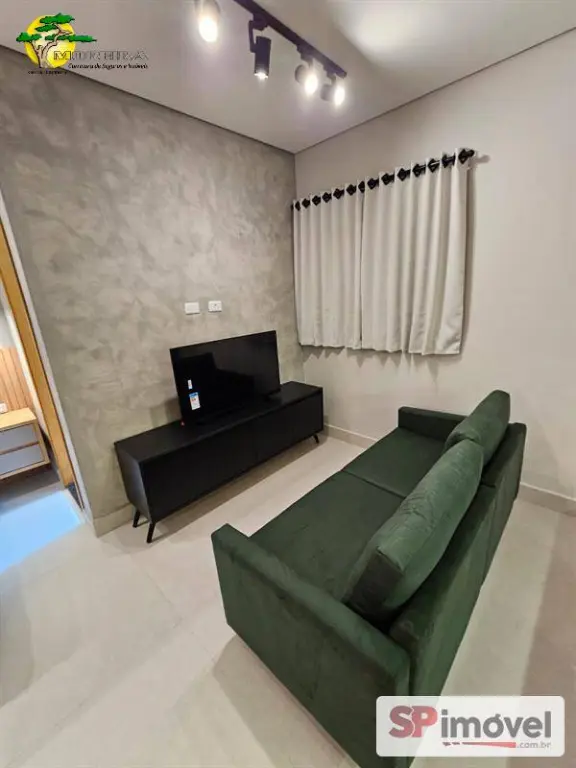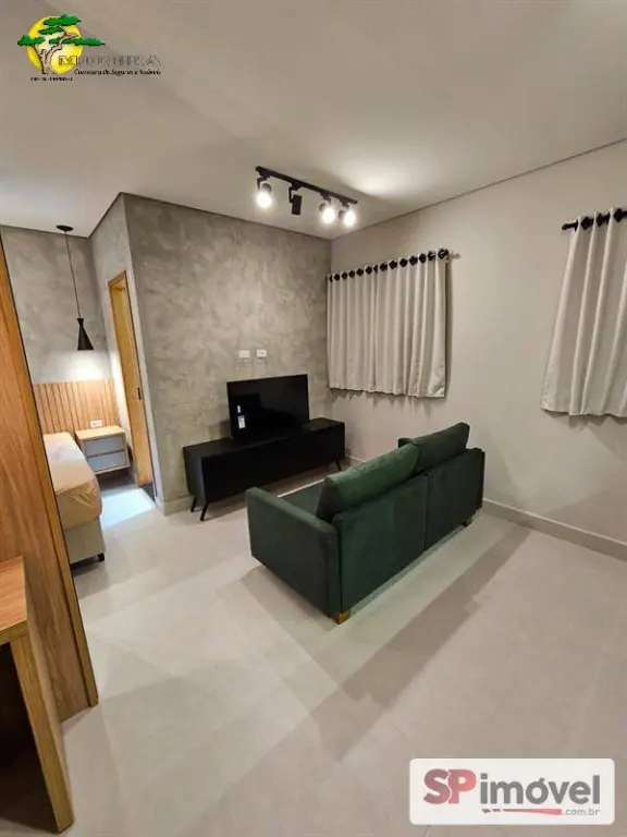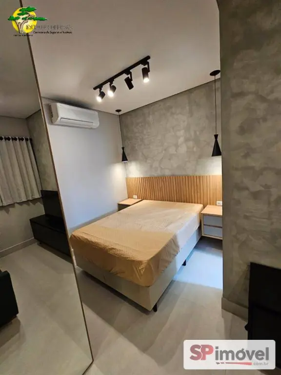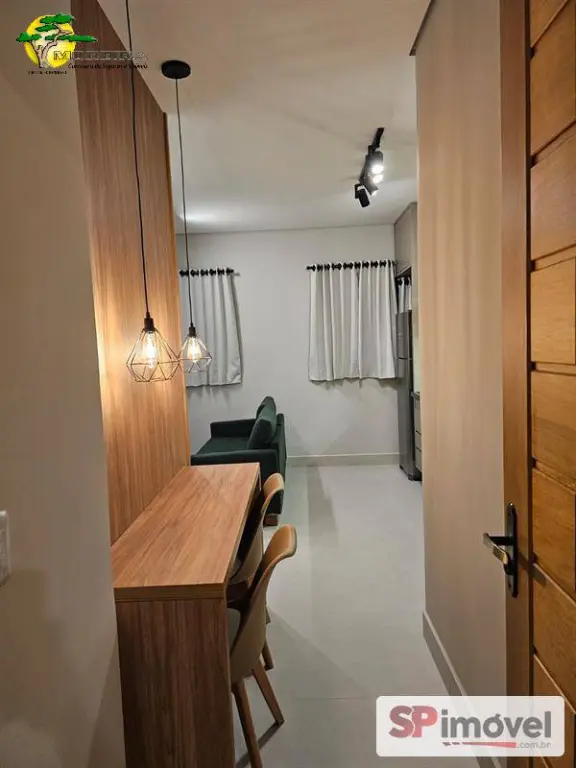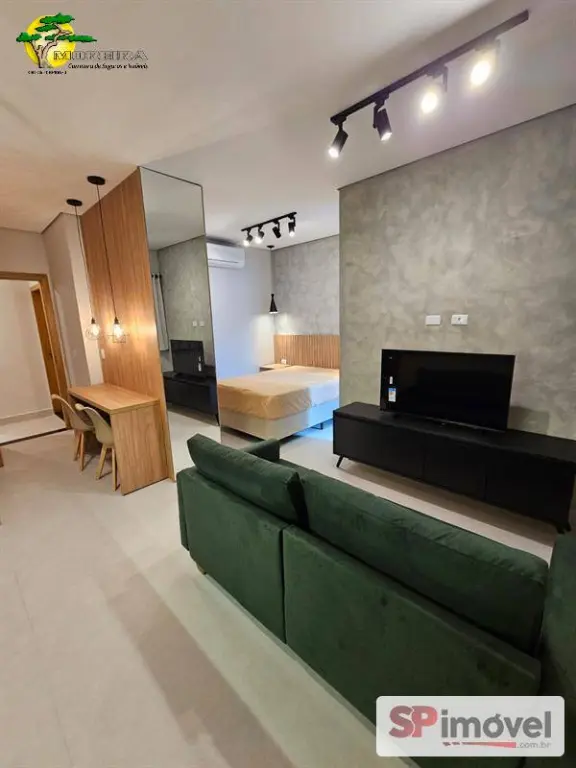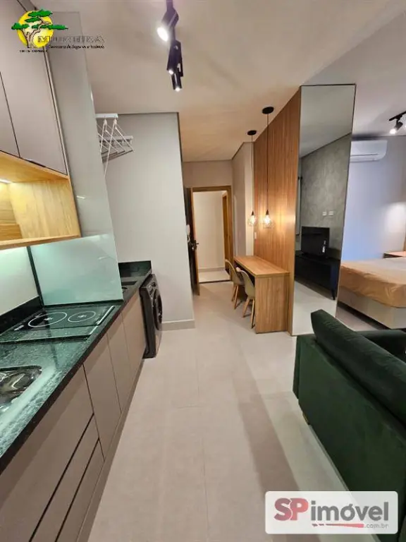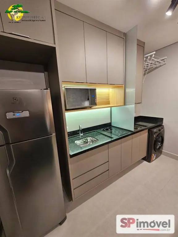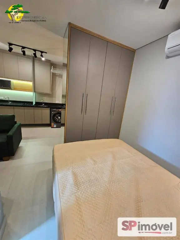 Studio 30m² novo, com geladeira, TV Smart, sofá, ar condicionado split, fogão, maquina de lavar, micro-ondas, cadeiras e cama. Armários planejados e um ótimo banheiro.