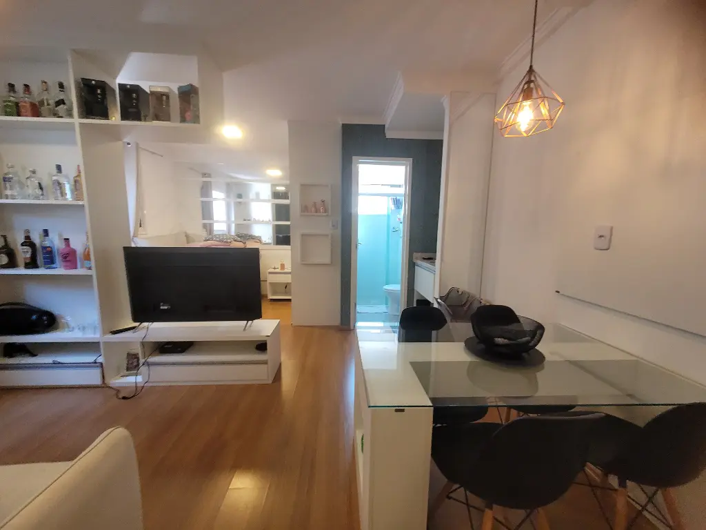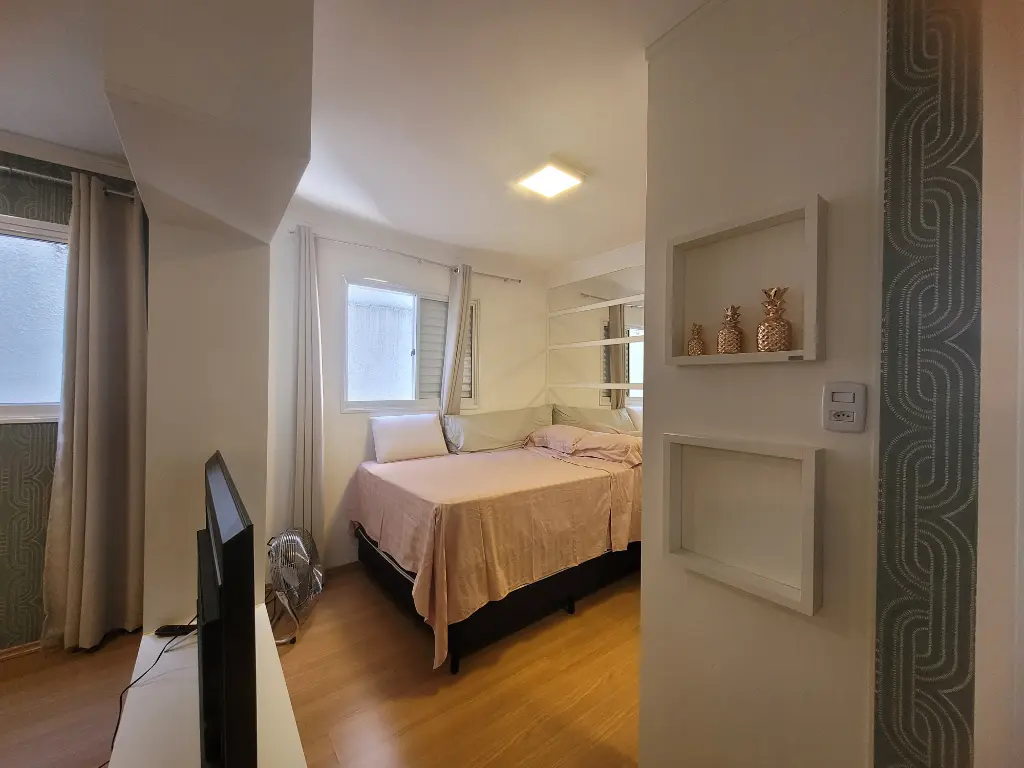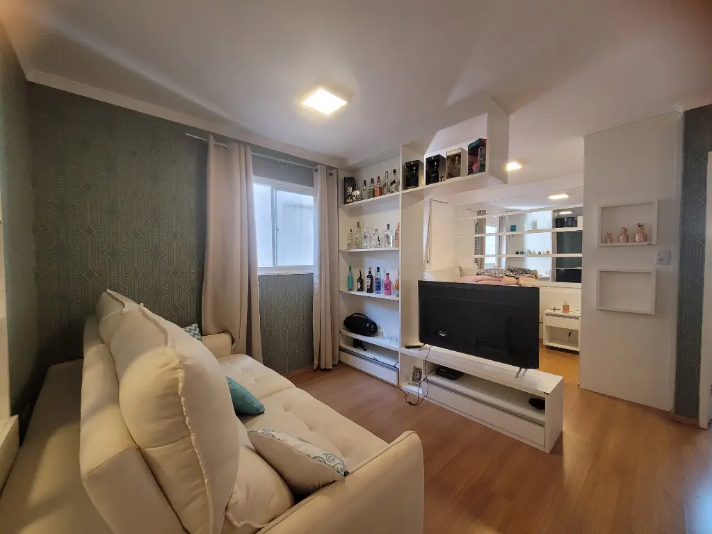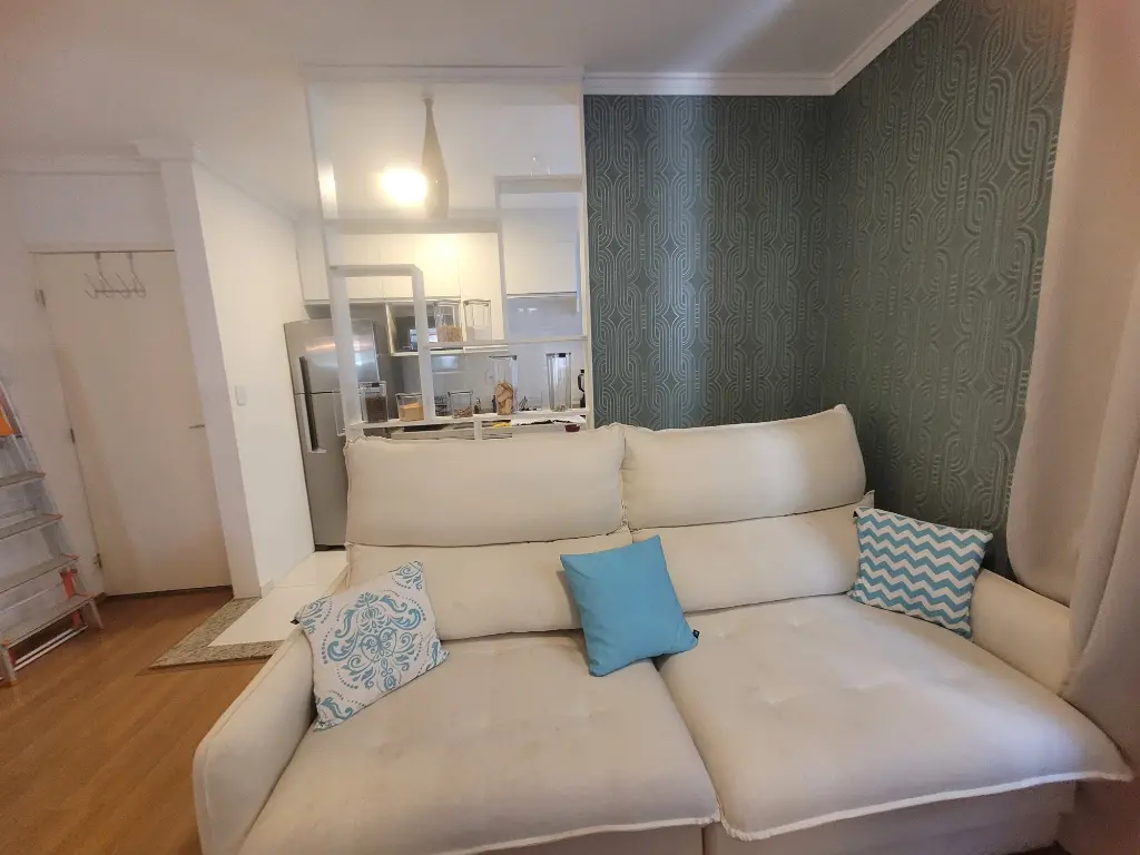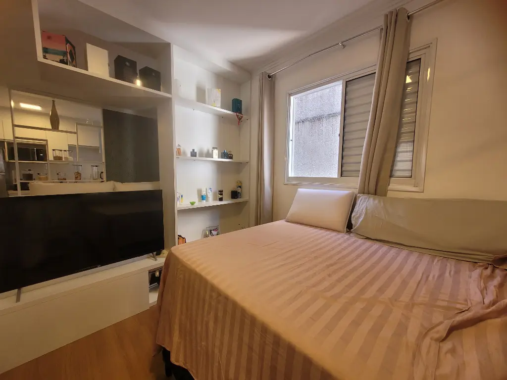 Apartamento lindo, bem decorado, com 35 m2 de área útil, sendo 1 quarto com armário planejado, sala com rack, mesa com 4 acdeiras, cozinha planejada com cooktop, forno, geladeira, armários, área de serviço, banheiro com chuveriro e box de vidro, espelho, papel de parede, cortinas. Condominio seguro, cameras de segurança em todo os condominio.