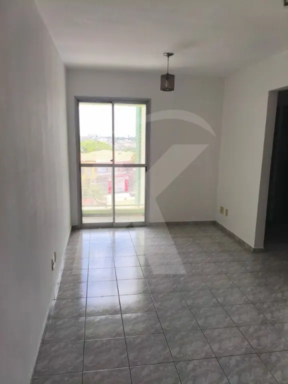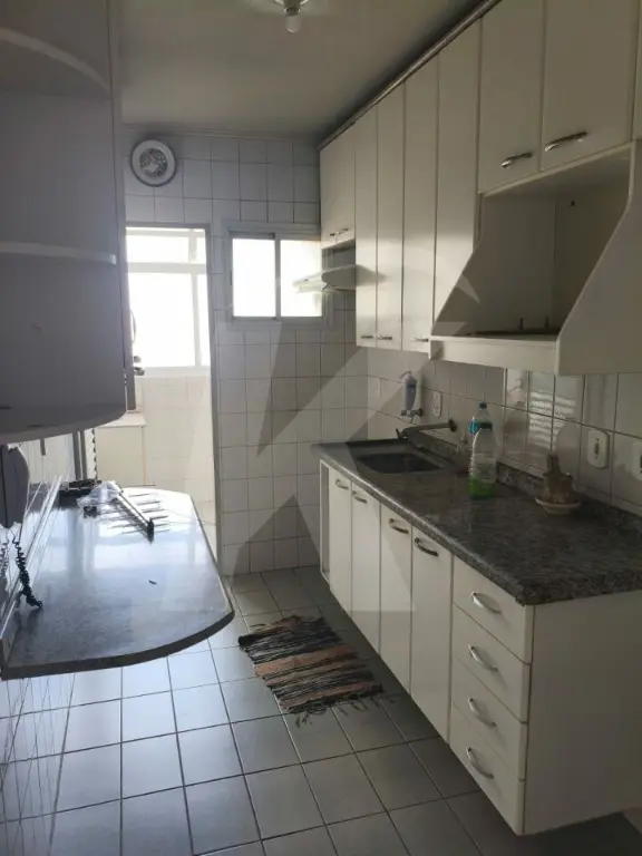 Apartamento com sala ampla e bem iluminada, varanda, cozinha espaçosa com armários planejados, lavanderia, três quartos e um banheiro.