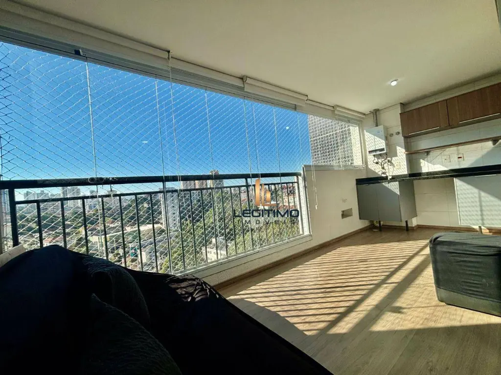 Ampla sacada com cortina de vidro, aquecedor a gás.