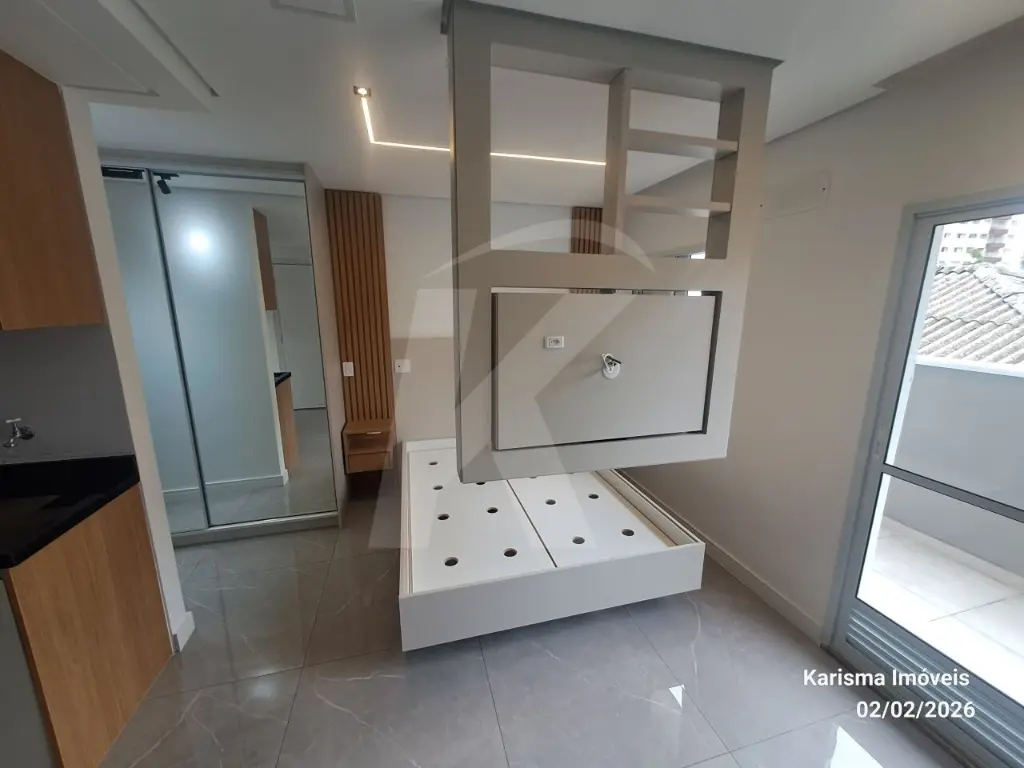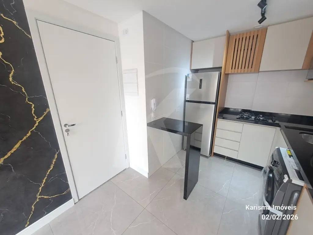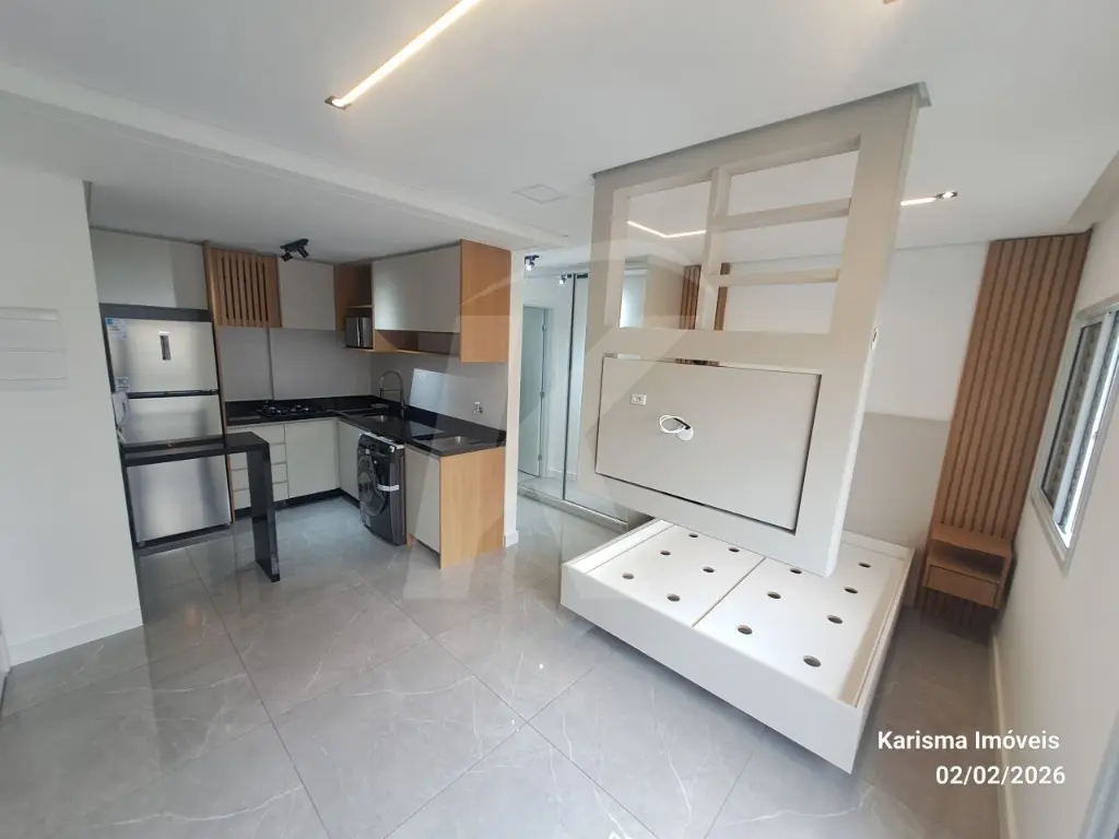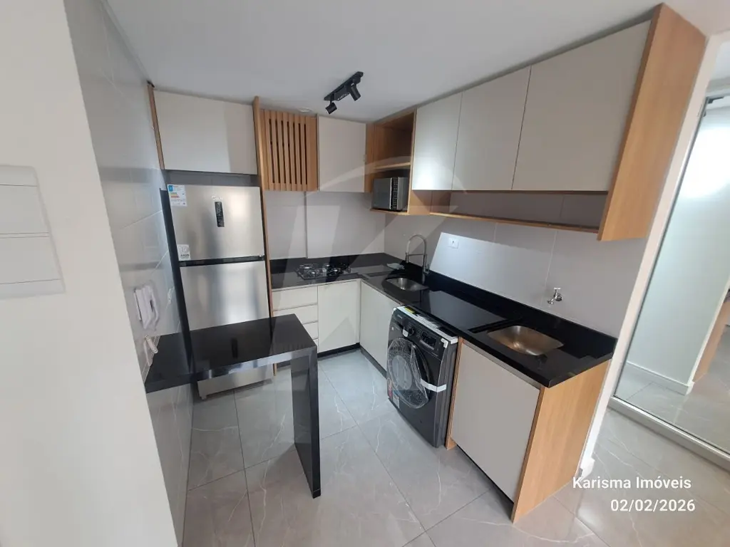 Mobílias: geladeira, máquina de lava e seca (11 kg), forno micro - ondas, cooktop, torneira de água quente, cama suspensa com 3 gavetas, painel giratório, nicho, guarda roupa com 2 portas e espelho.