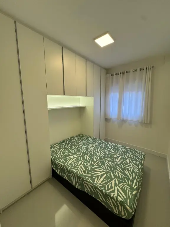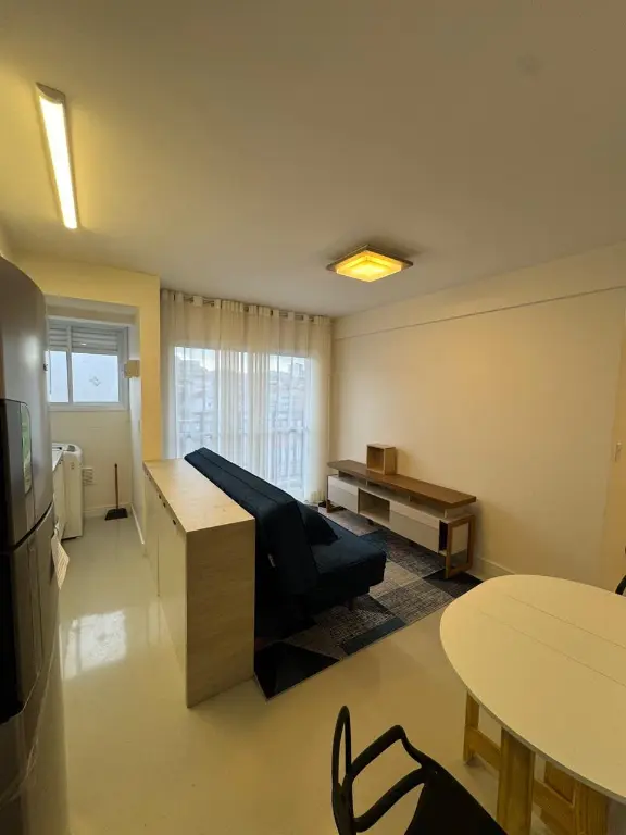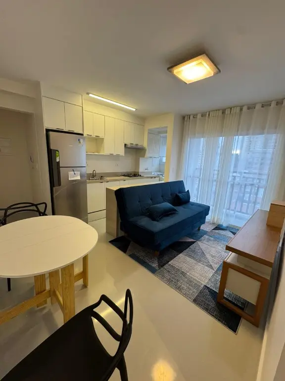 O imóvel possui sala 2 ambientes com sacada, 2 dormitórios, ambos com armários planejados, sendo um com cama de casal e outro com cama de solteiro, oferecendo praticidade imediata para quem busca morar com conforto ou investir em locação de longo prazo. A sala é bem distribuída e iluminada, mobiliada com sofá e rack, integrada à sacada, que proporciona ventilação natural, luminosidade e um espaço agradável para relaxar.