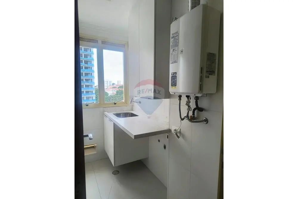 Área de serviço equipada com armário, varal e máquina lava e seca