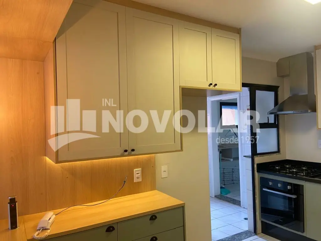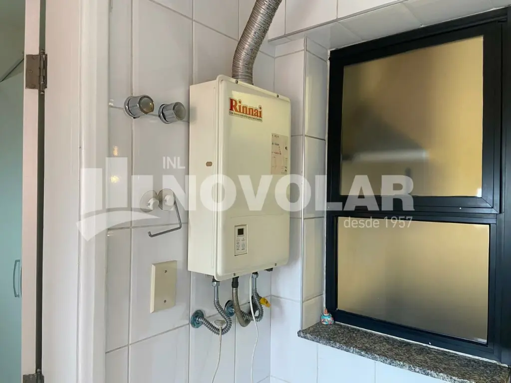A cozinha planejada conta com armários, oferecendo praticidade no dia a dia. O apartamento também dispõe de lavabo, banheiros com box acrílico, dependência de empregada com banheiro, além de área de serviço bem ventilada.