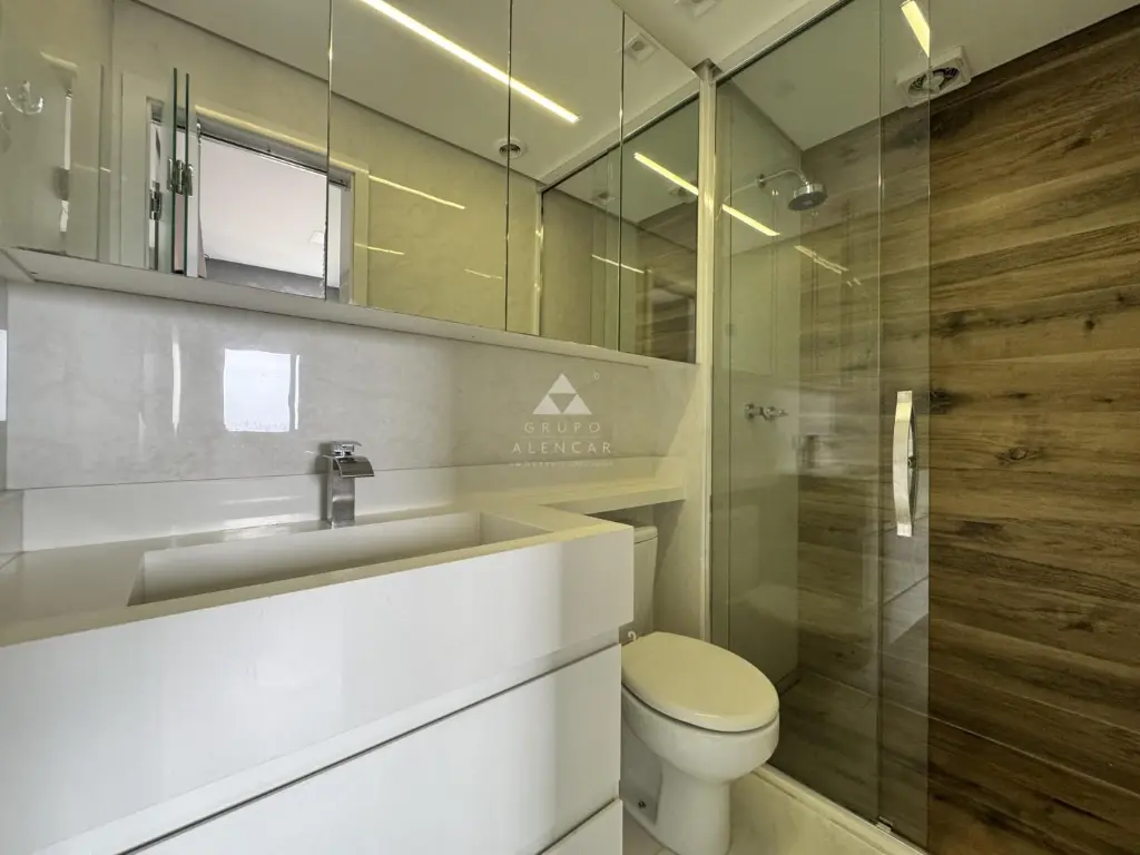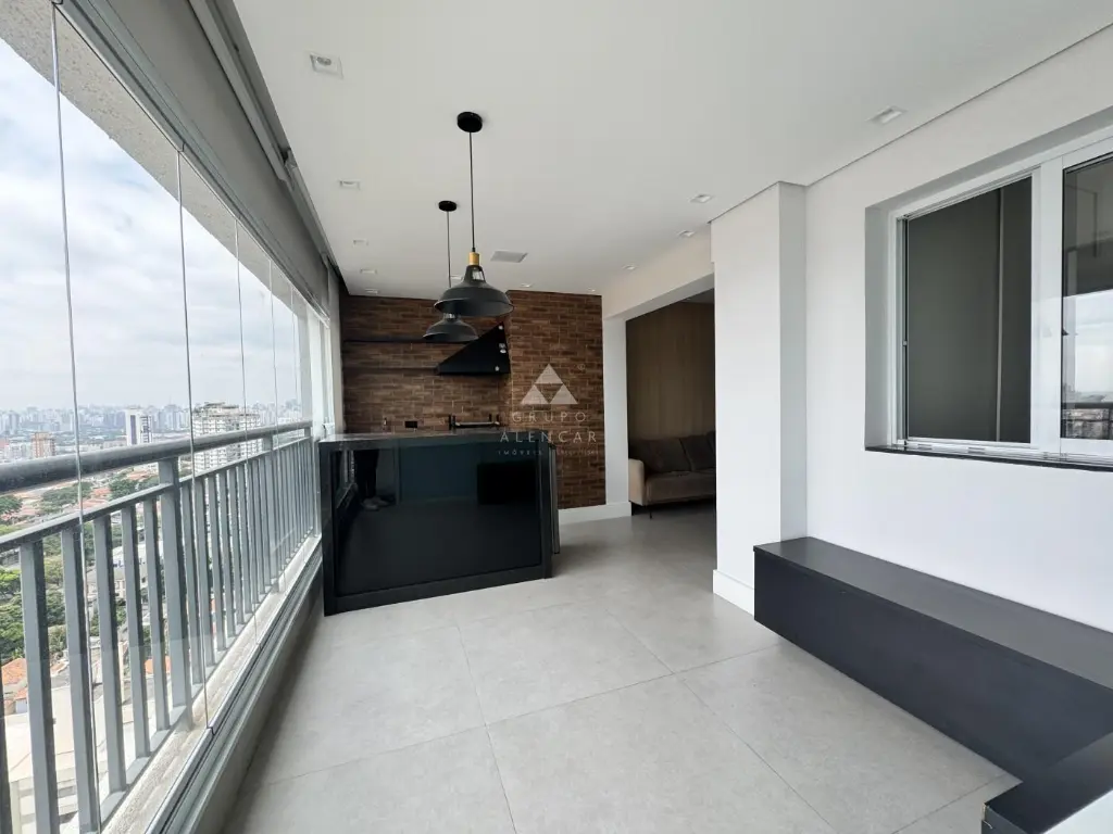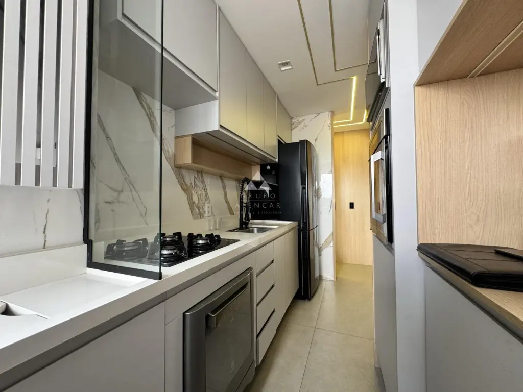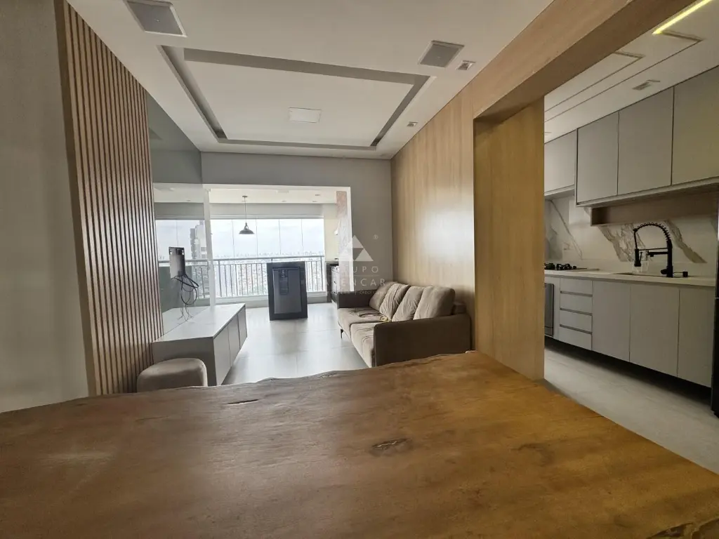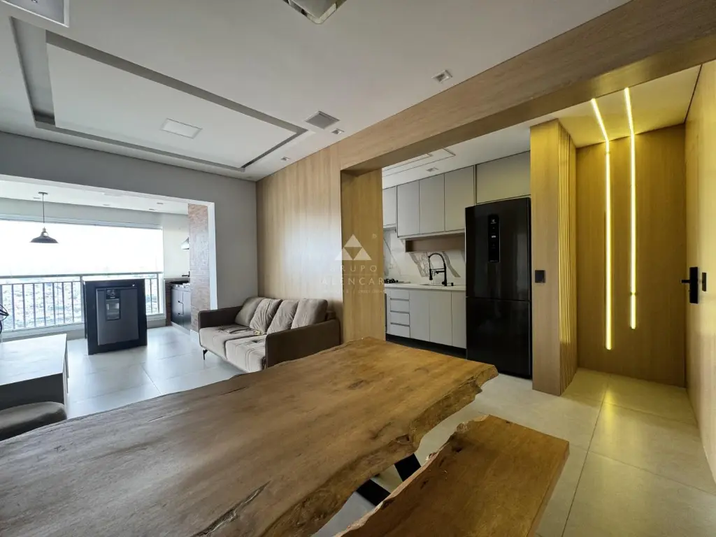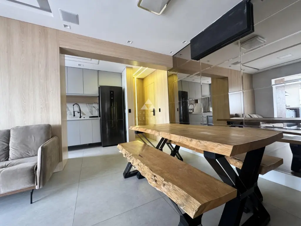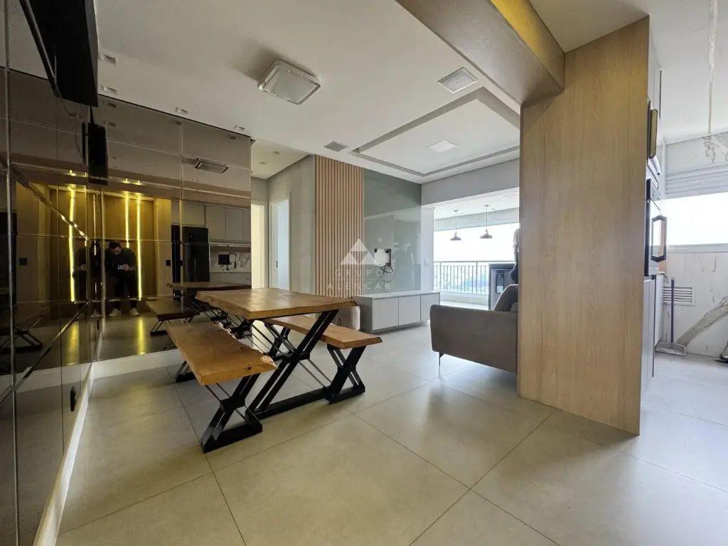 Conta com 2 dormitórios (1 suíte), Sala em dois ambientes, Sacada gourmet com mesa rústica, Cozinha americana com armários, forno, geladeira, lava-louças, Área de Serviço com máquina de lavar lava-seca, banheiros com box e armários e Vaga de garagem.