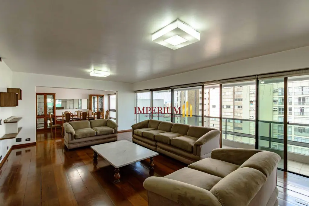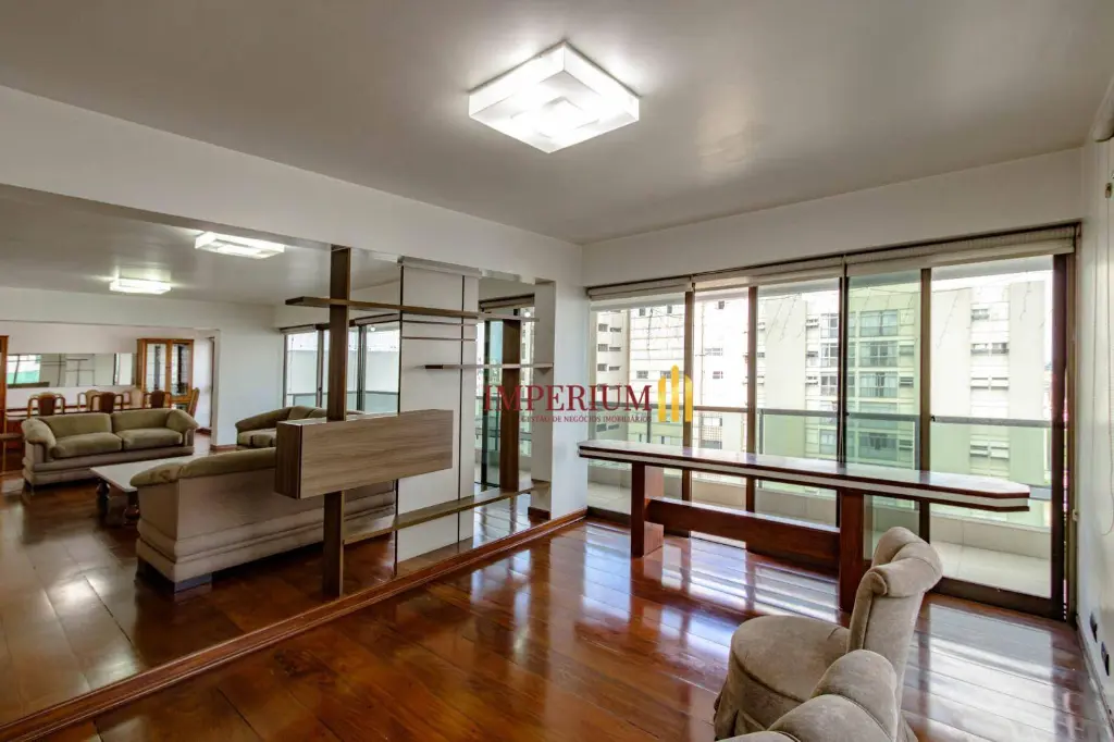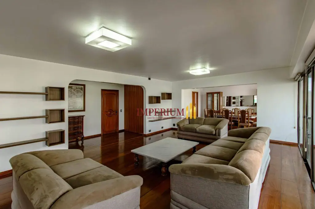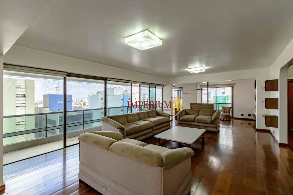 Observações: Excelente apartamento semi mobiliado com 485 m², oferecendo elevador e hall privativos, amplas salas de jantar, visitas, estar e TV, além de escritório, 4 suítes (sendo uma master com closet), copa, cozinha, despensa, lavanderia, 2 dormitórios de serviço com banheiro e 4 vagas de garagem livres. Condomínio com portaria 24 horas, áreas de estar, salão de festas, piscina, academia e sauna, garantindo conforto, segurança e lazer completo.
