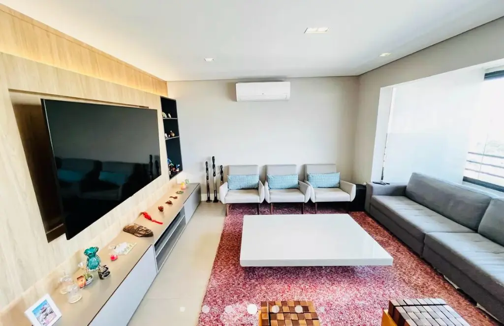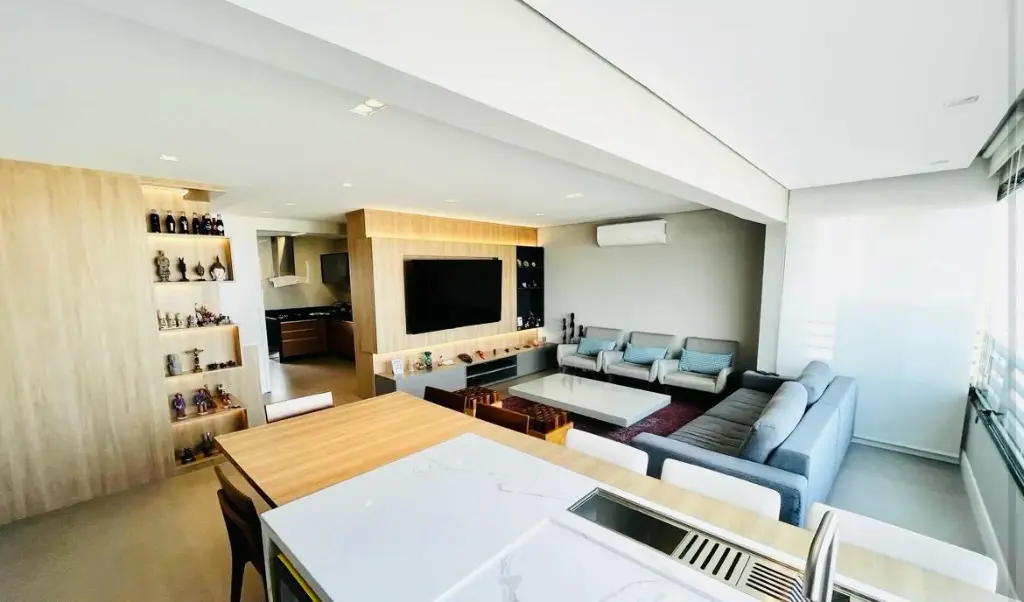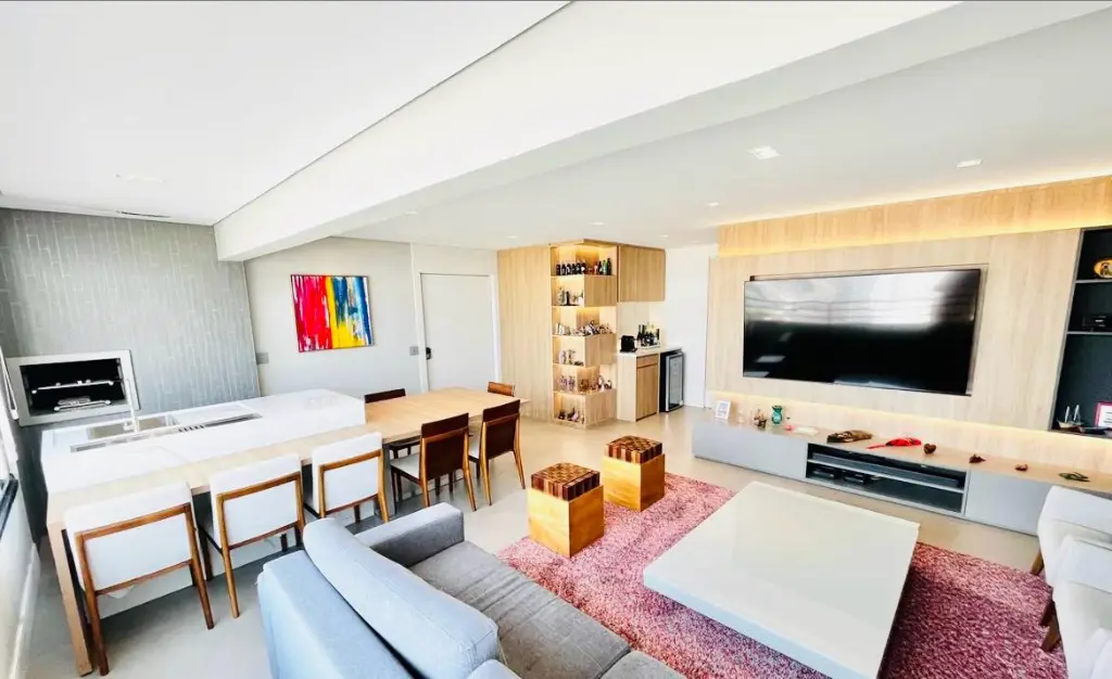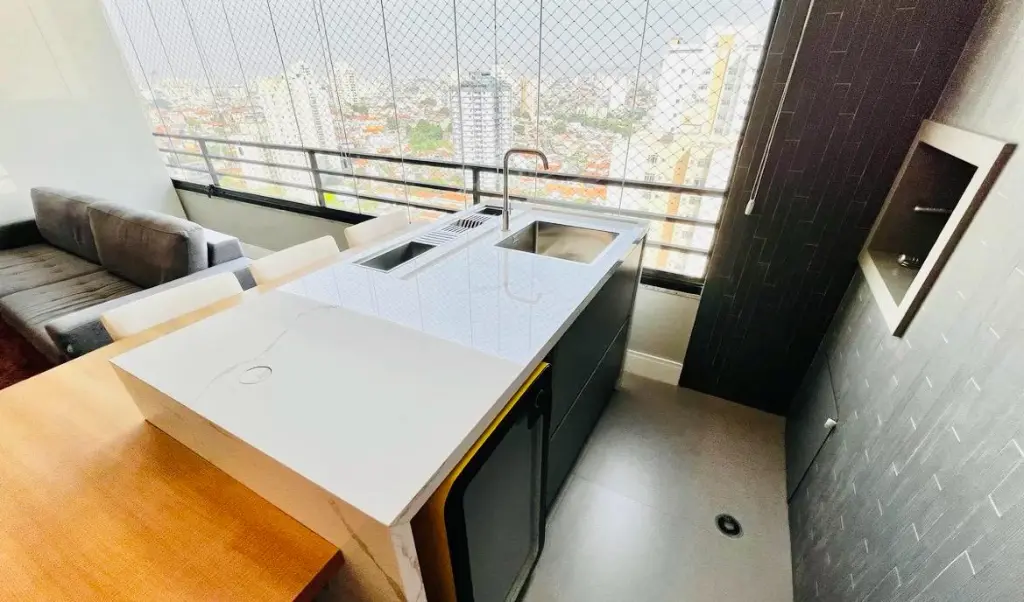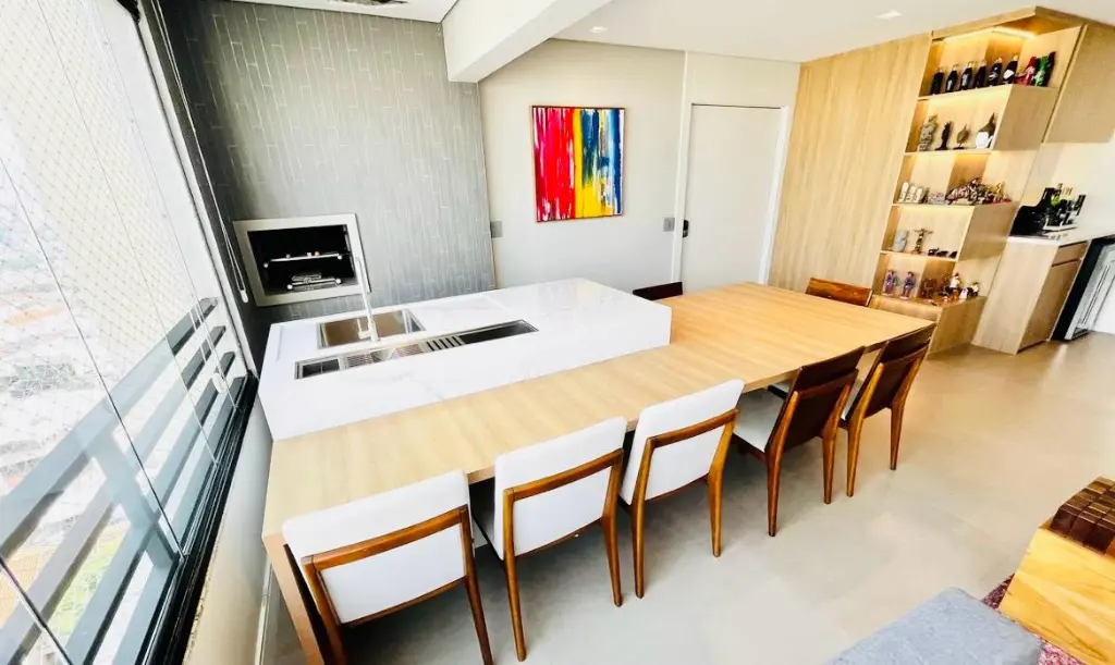 Andar alto com vista deslumbrante do pôr do sol, são 116 m², 3 dormitórios, sendo 1 suíte, sala com ambientes amplos integrada a varanda com churrasqueira, lavabo e banheiro social, cozinha planejada espaçosa e funcional, lavanderia e quarto de empregada transformado em escritório e 3 vagas de garagem.