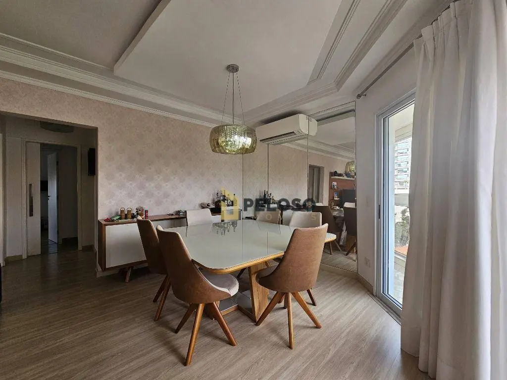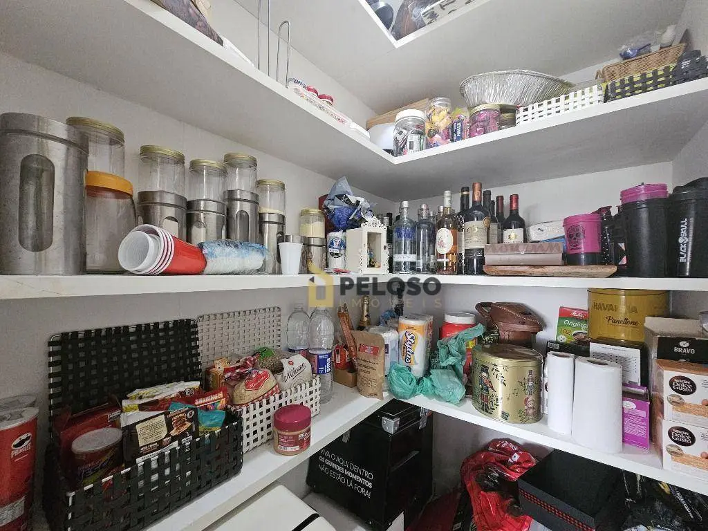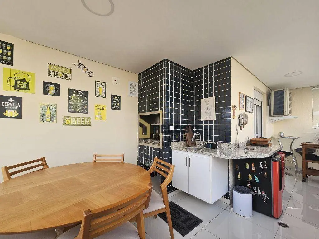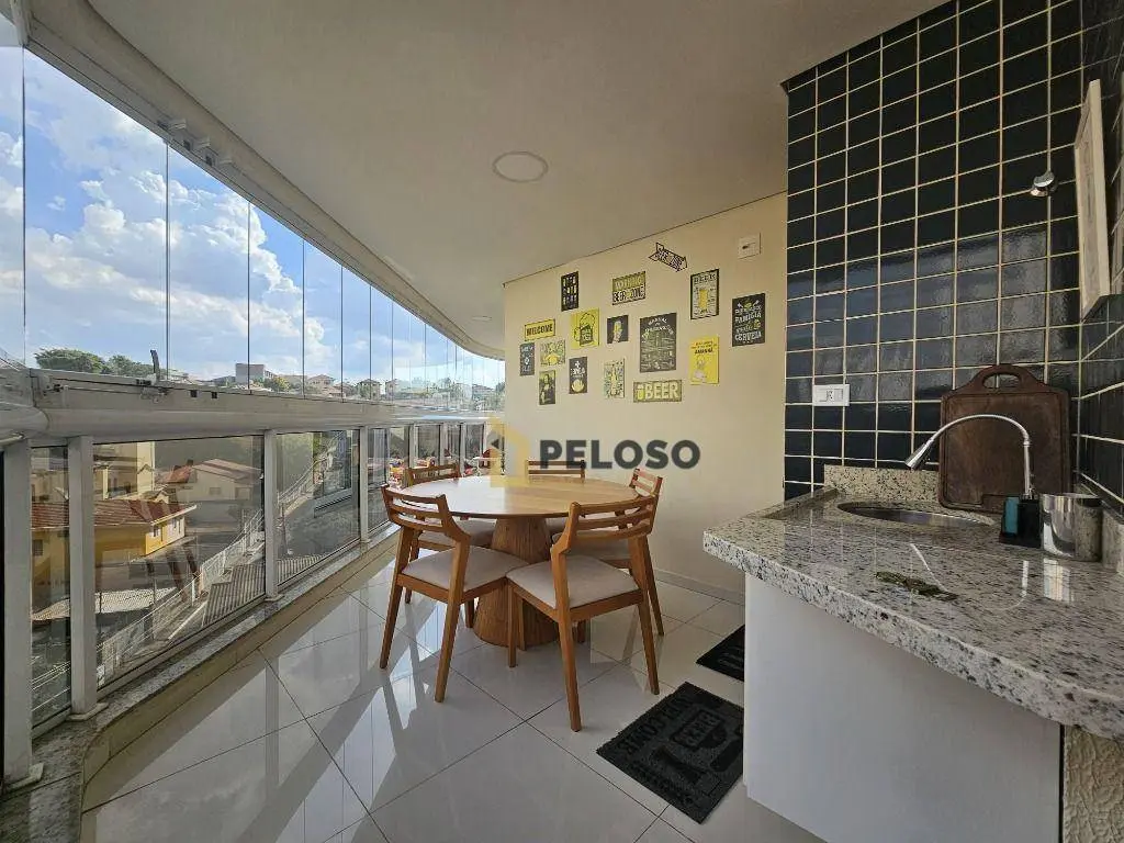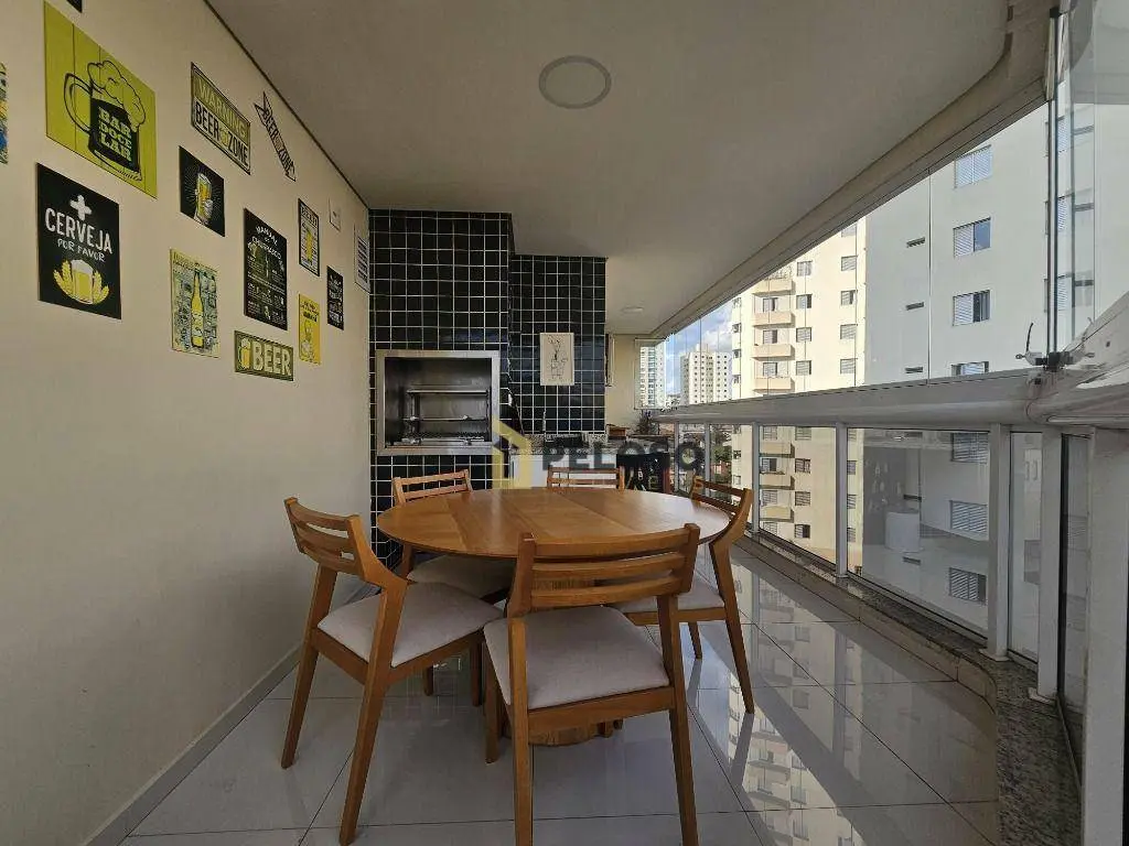 3 suítes com armários e varanda sendo a master com closet, sala ampla para 2 ambientes, lavabo, varanda gourmet com fechamento em vidro, cozinha equipada com fogão embutido, coifa e armários, despensa, área de serviço com armários, dependência completa e 3 vagas de garagem fixas.