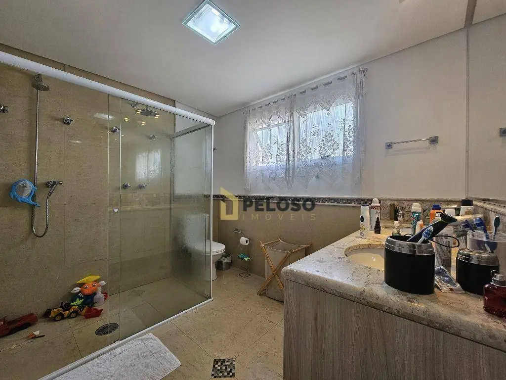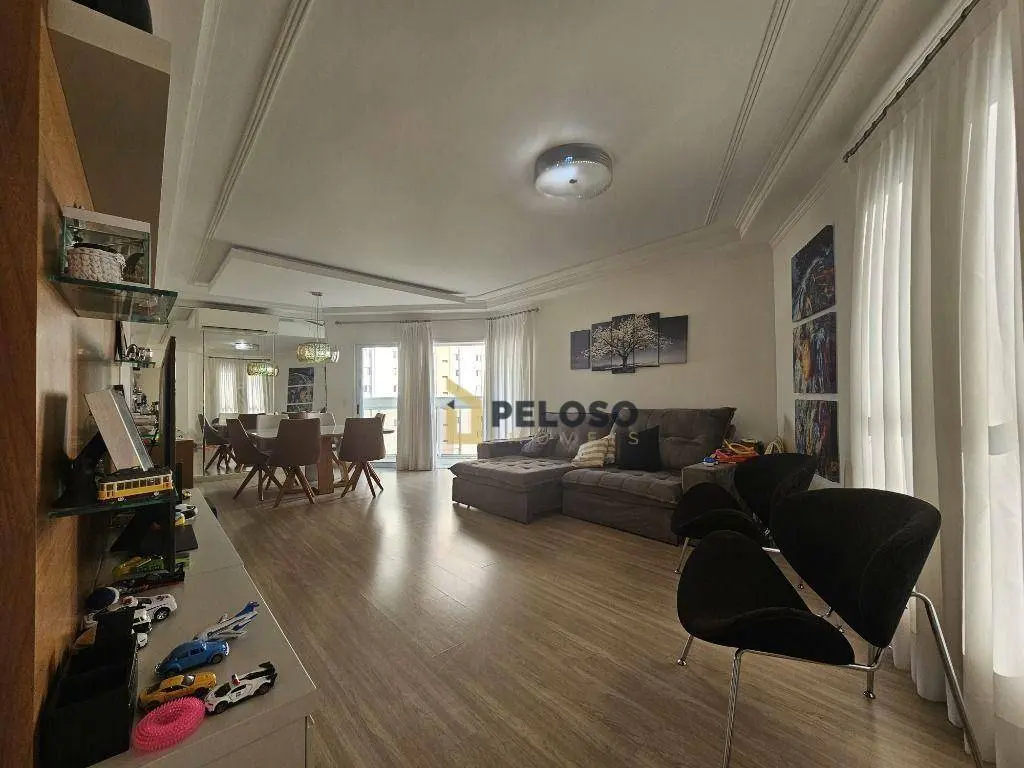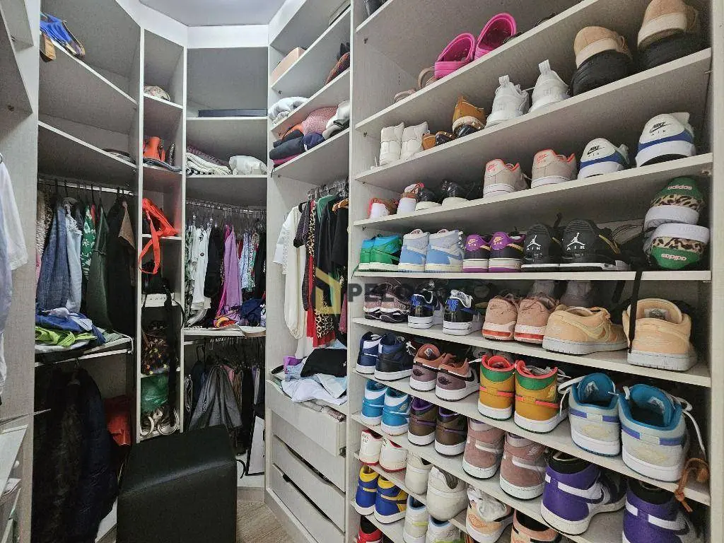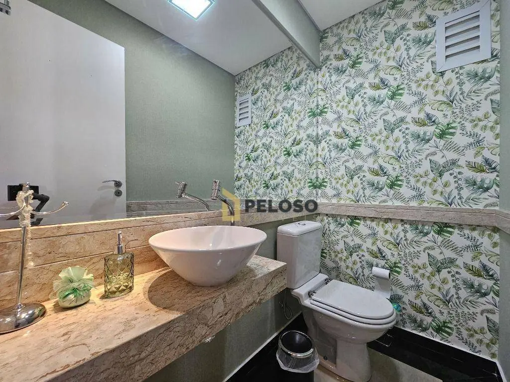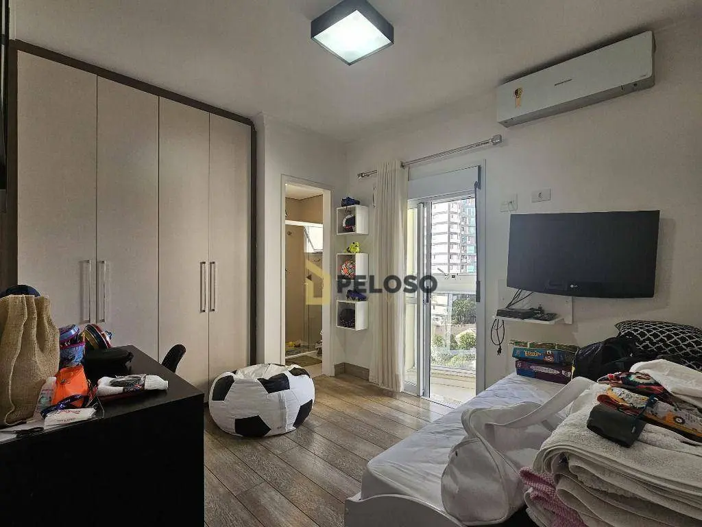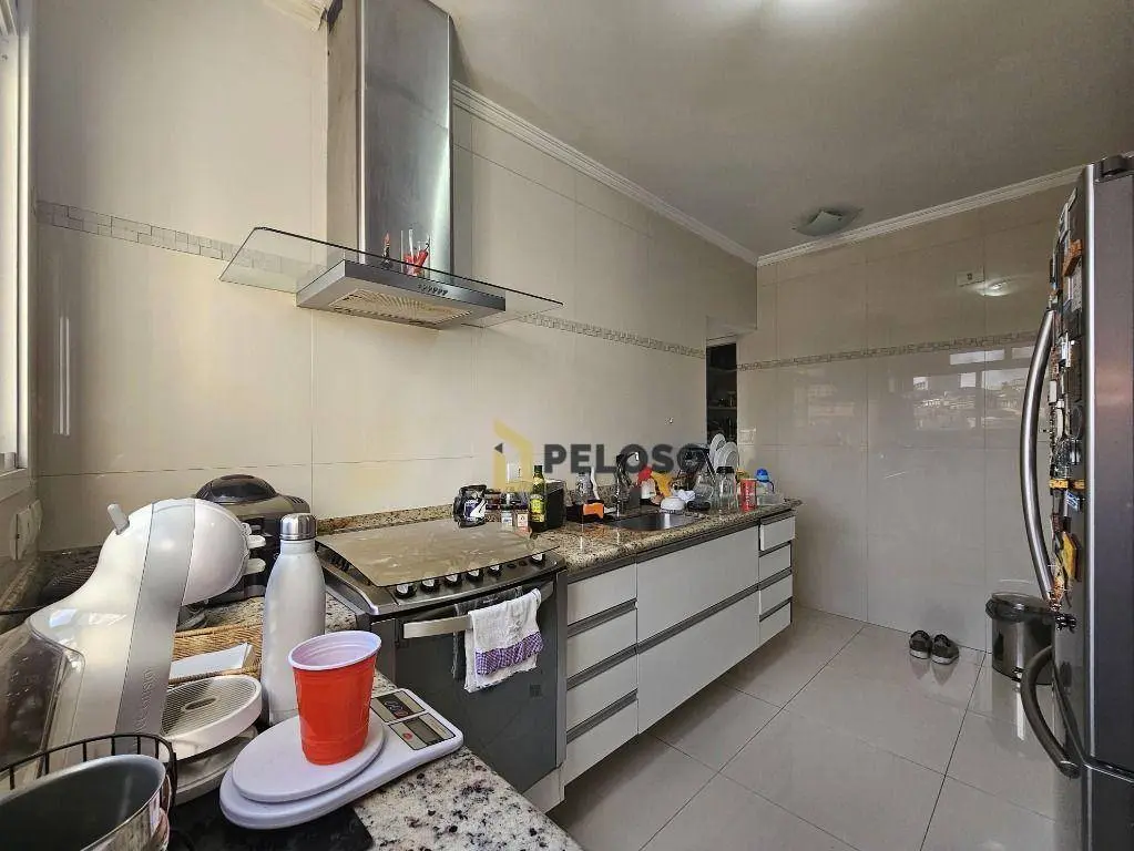 3 suítes com armários e varanda sendo a master com closet, sala ampla para 2 ambientes, lavabo, varanda gourmet com fechamento em vidro, cozinha equipada com fogão embutido, coifa e armários, despensa, área de serviço com armários, dependência completa e 3 vagas de garagem fixas.