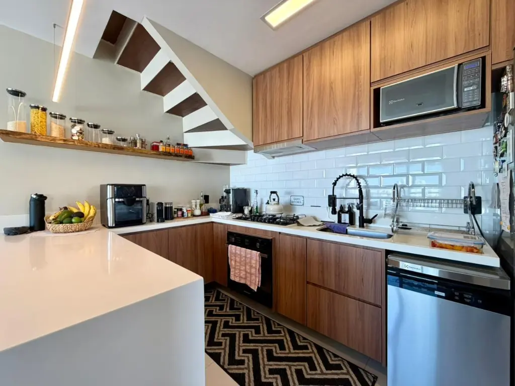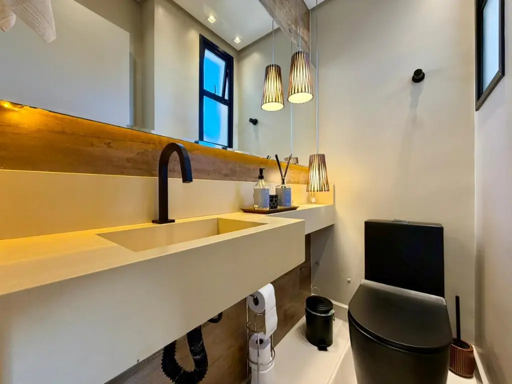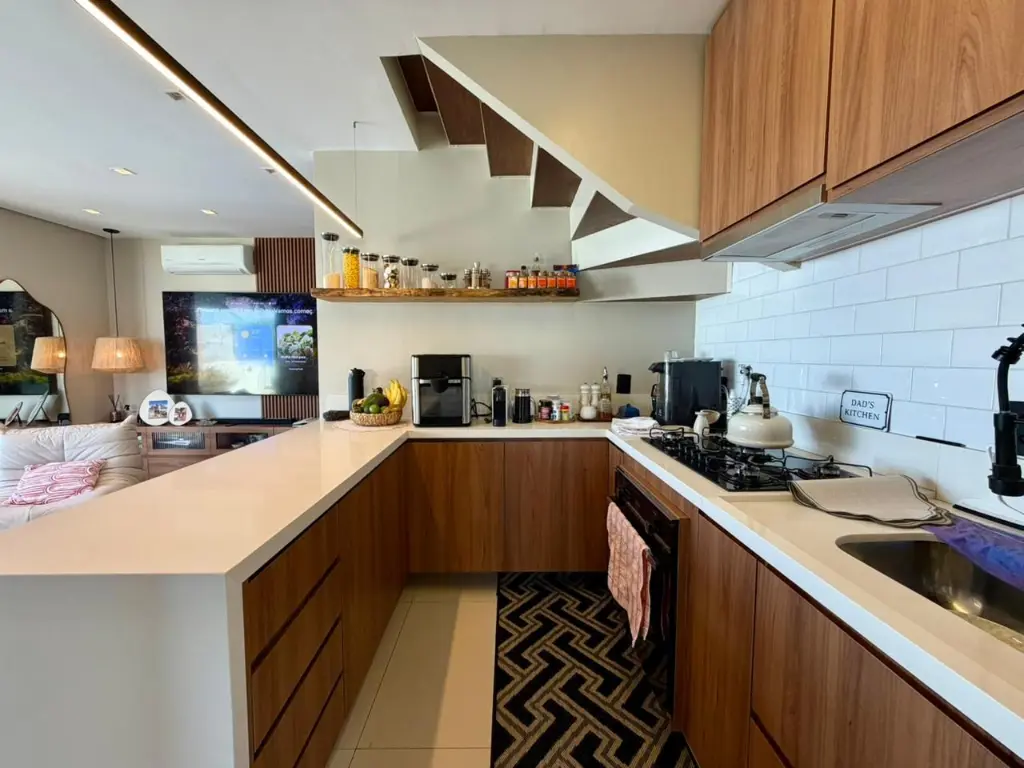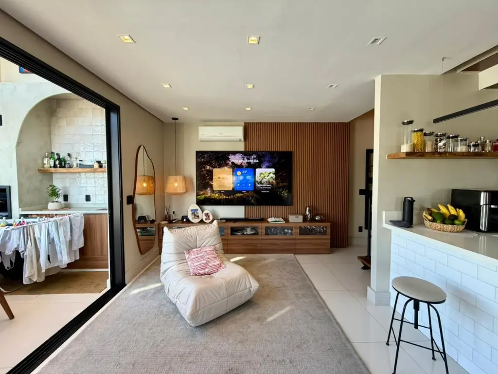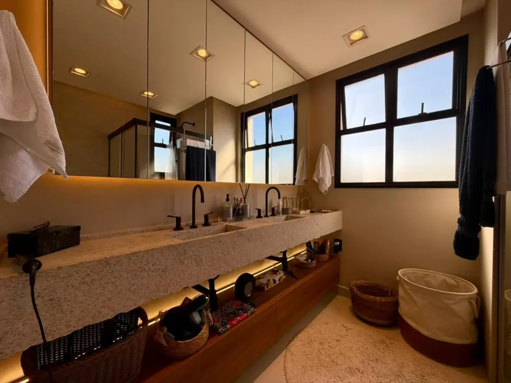O apartamento possui 2 dormitórios, lavabo e banheiro com pia dupla, além de uma cozinha americana integrada, que se conecta perfeitamente aos ambientes sociais.