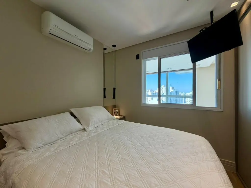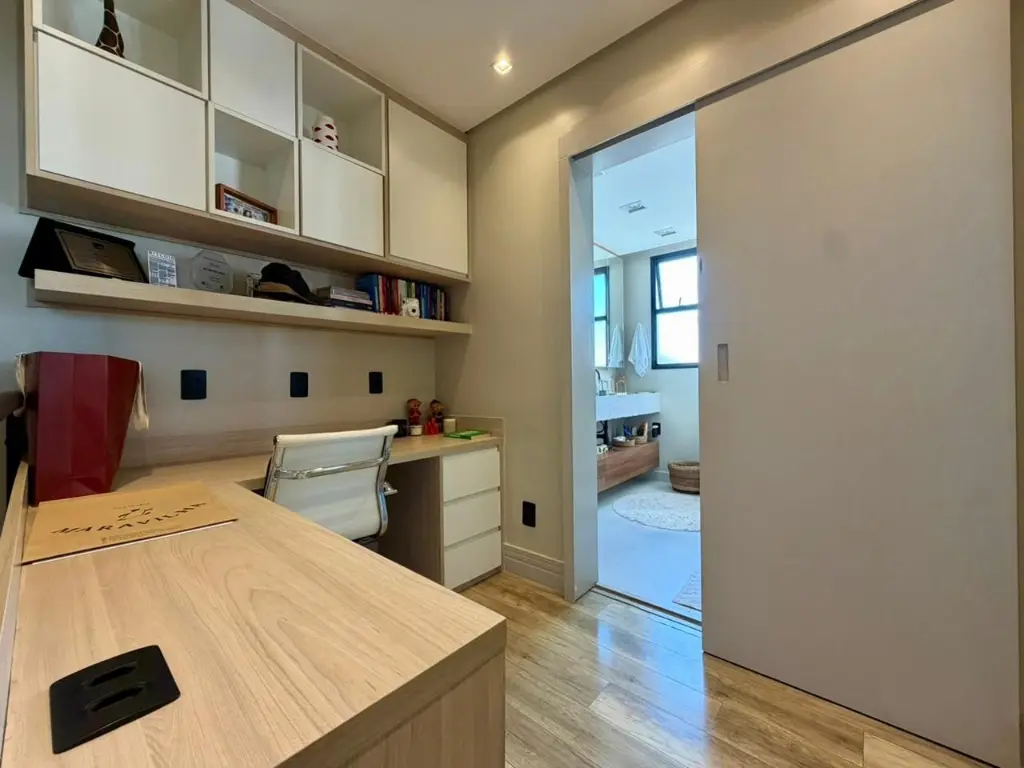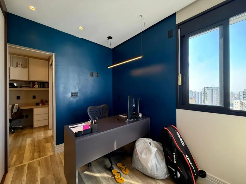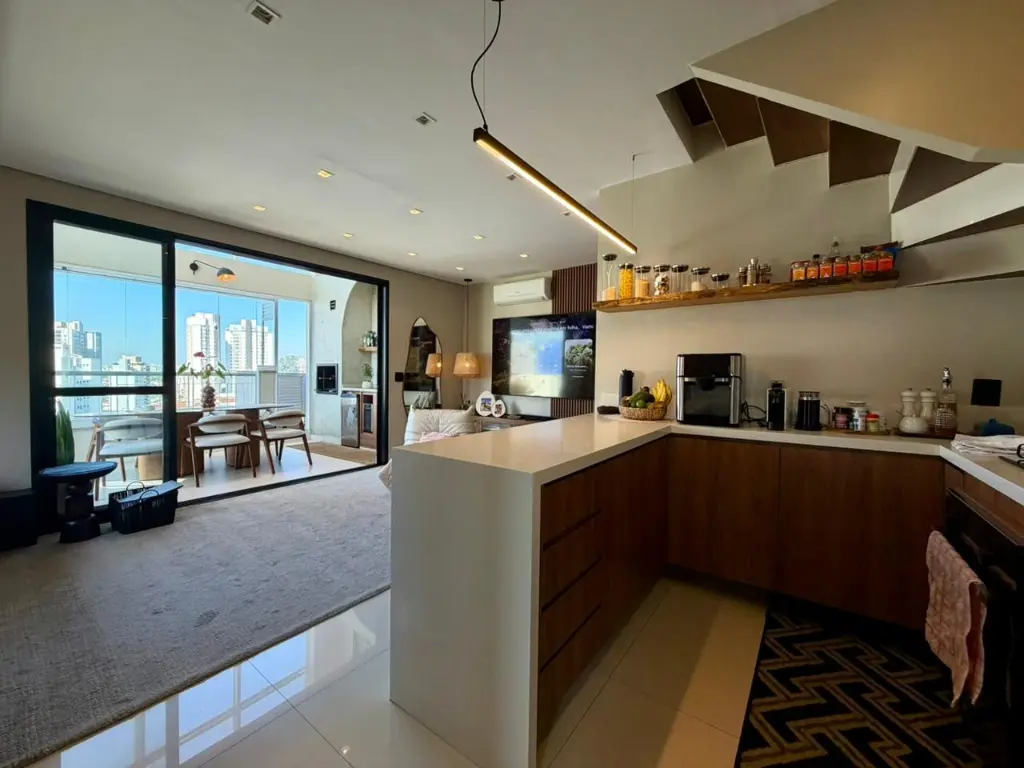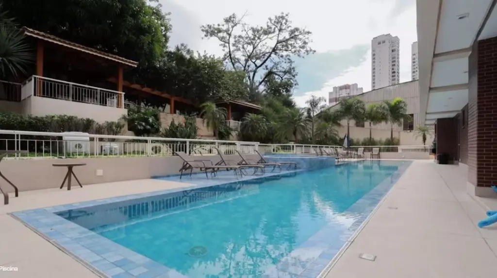 A cozinha conta com triturador de alimentos na pia, máquina de lavar louça, geladeira, além de máquina de lavar roupas. O imóvel também inclui televisão de 85 polegadas e mesa com cadeiras em madeira maciça, mantendo o padrão de qualidade e elegância. O apartamento dispõe ainda de 2 vagas de garagem, garantindo comodidade e praticidade no dia a dia. O condomínio oferece infraestrutura completa de lazer, com piscina, sauna, academia, quadra de squash, lavanderia coletiva, sala de reunião, brinquedoteca e espaço pet, atendendo às necessidades de toda a família.