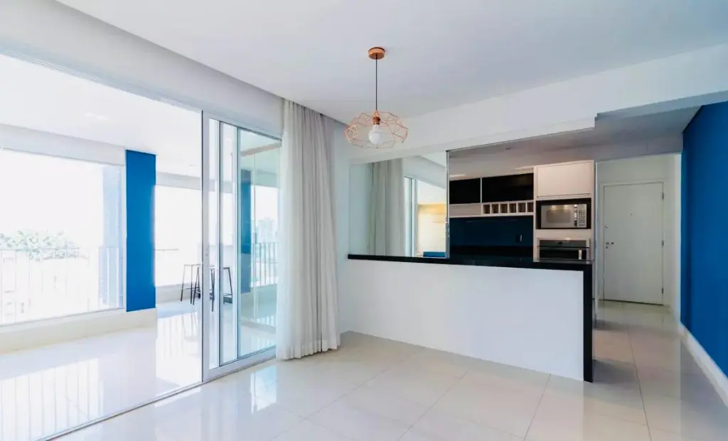 Sala de estar com móvel planejado rack e ar-condicionado, cortina com forro feita sob medida, sala de jantar com espelho, varanda ampla com cristaleira embutida portas de vidros, além de um móvel embutido com espaço para TV, frigobar ou cervejeira, prateleiras e um armário pequeno com gaveta e porta, todo maquinário do ar condicionado fica embutido na varanda