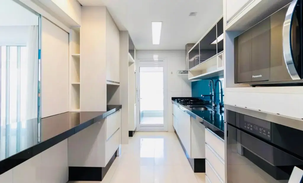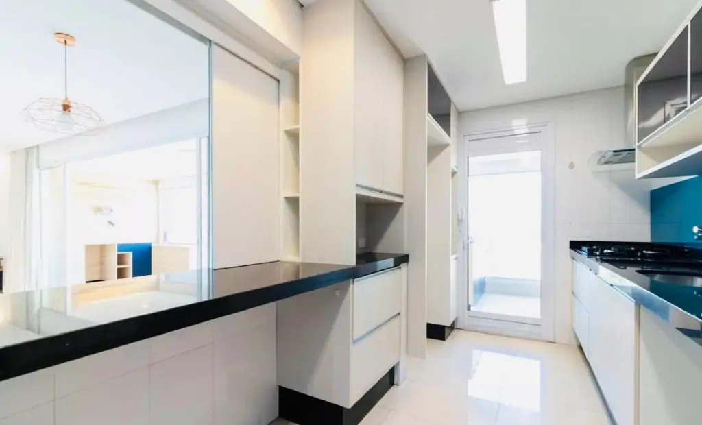 Cozinha mobiliada com Cook top, coifa, forno embutido e filtro de água, além da bancada com pedra de mármore que acomoda 3 banquetas para refeições rápidas tendo um fechamento opcional com portas de correr sobre a bancada que possibilita uma cozinha americana. Lavanderia com armários e gavetão Todeschini, varal e bancada de mármore e sapateira ampla com portas de correr,