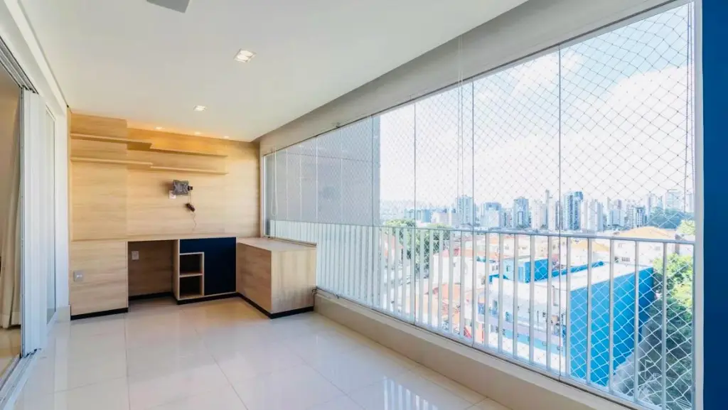 A varanda tem fechamento completo de vidro e tbm de cortinas de rolo.