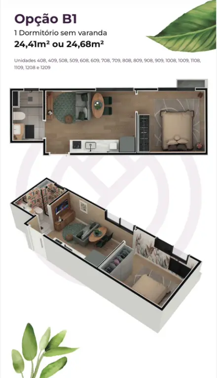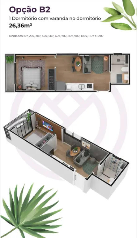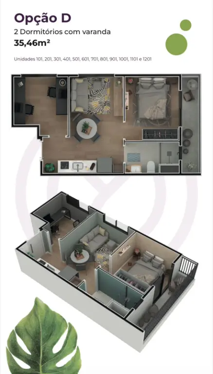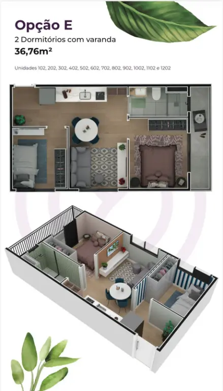 2 dormitórios com varanda unidades com 36,76 e 35,46m²