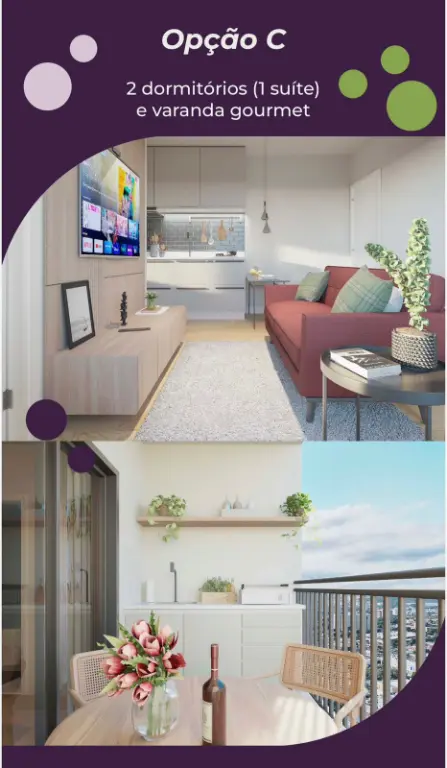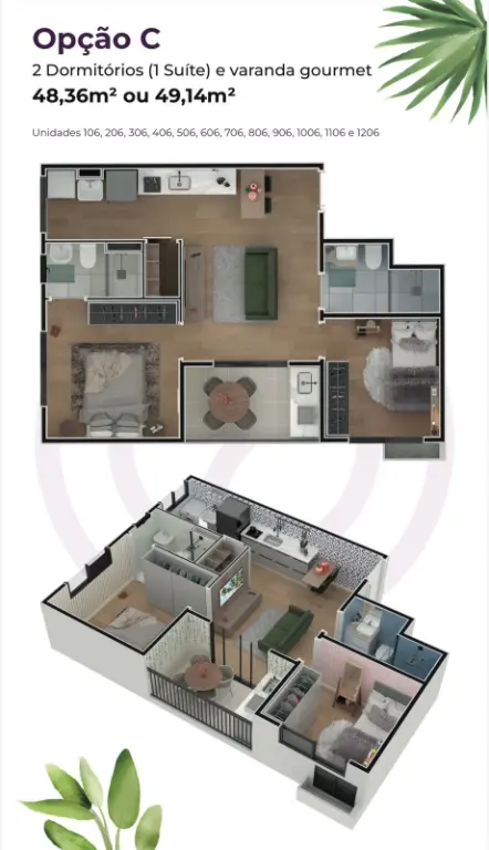 2 dormitórios com varanda e suíte, unidades com 48 m² ou 49 m²