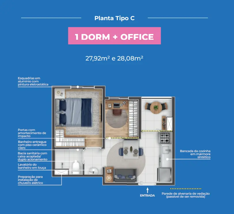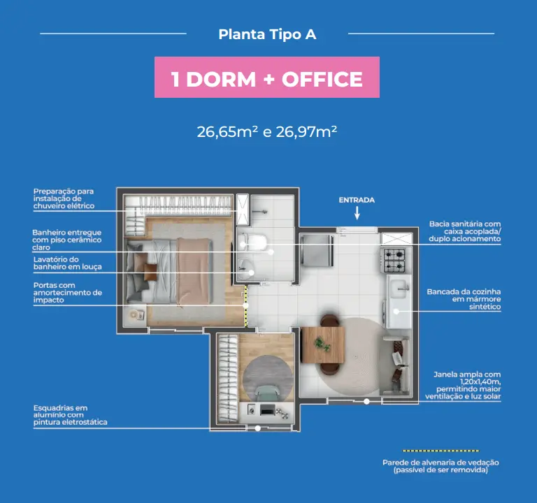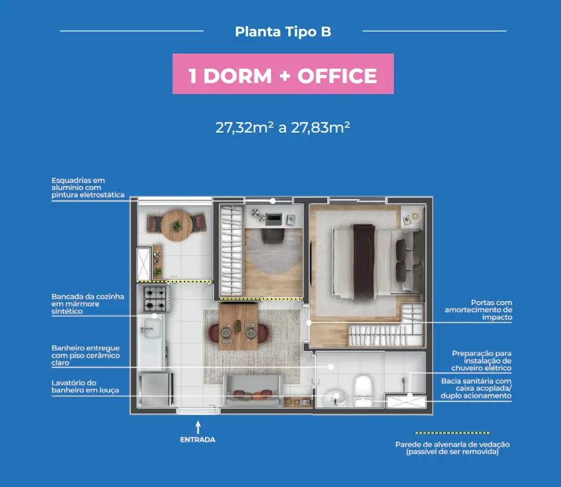 Os apartamentos seguem o conceito Multidormitórios (1 dormitório + office), com plantas inteligentes que se adaptam à sua fase de vida. O espaço extra pode virar home office, closet, ateliê, quarto gamer ou ambiente multifuncional, do jeito que você precisar.