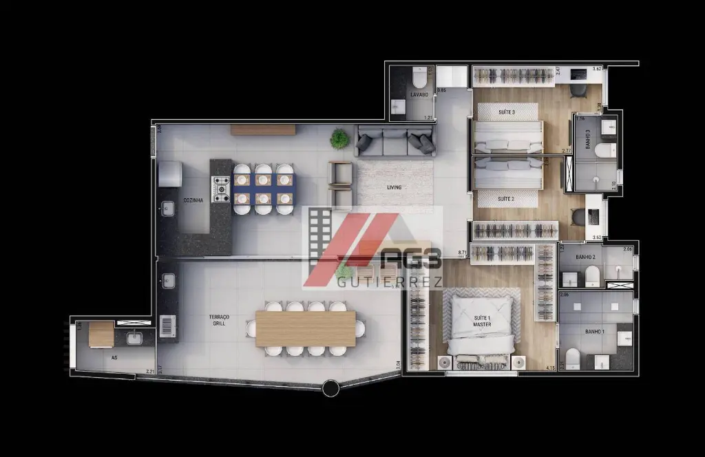Esse apartamento possui uma planta 111m² distribuídos em 3 dormitórios sendo todos suíte e uma suíte master com estrutura estilo closet, um lavabo, amplo living para 2 ambientes, uma espaçosa varanda gourmet e duas vagas de garagem vinculadas e cobertas (sem sorteio e manobras de carro de vizinhos). A cozinha já integrada com a estrutura da sala completa o espaço interno e área de serviço fica mais isolada ao fundo da varanda. Os apartamentos serão entregues com a estrutura de automação para Alexa que podem ser usados para as lâmpadas, persianas e eletrodomésticos e também possuem toda estrutura para receber a instalação de ar-condicionado em todos ambientes e aquecimento de água a gás.