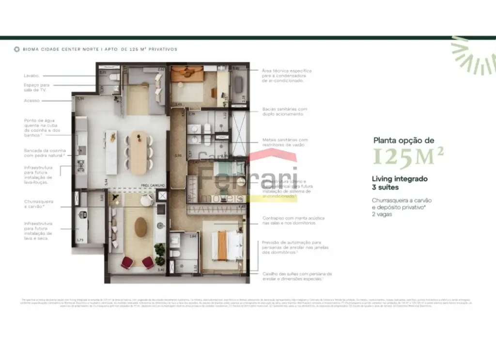 Planta de 125 Metros quadrados, 3 suítes, living integrado, varanda gourmet churrasqueira a carvão, depósito privativo e 2 vagas.