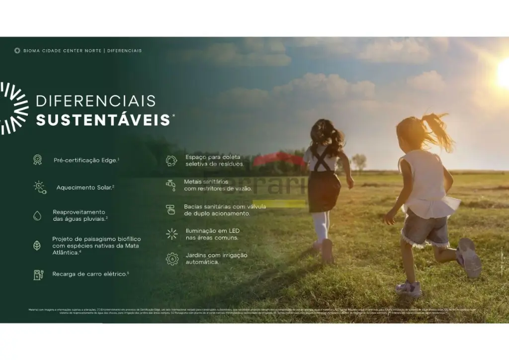Diferenciais na entrega da unidade: Lavabo; Acesso; Espaço para TV; Área técnica específica para a condensadora de ar-condicionado; Metais sanitários com restritores de vazão; Bacias sanitárias com duplo acionamento; Contrapiso com manta acústica nas salas e nos dormitórios; Infraestrutura (dreno e carga elétrica) para futura instalação de sistema de ar-condicionado2; Previsão de automação para persianas de enrolar nas janelas dos dormitórios.1; Caixilho das suítes com persiana de enrolar e dimensões especiais.1; Infraestrutura para futura instalação de lava e seca; Churrasqueira a carvão; Infraestrutura para futura instalação de lava-louças; Bancada da cozinha com pedra natural; Ponto de água quente na cuba da cozinha e dos banhos;