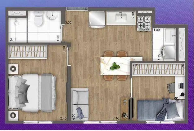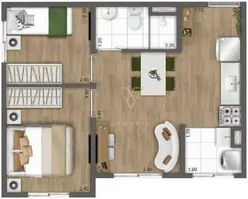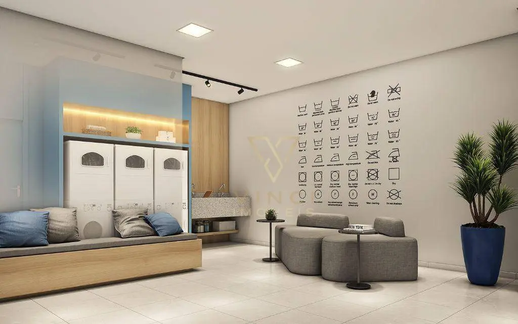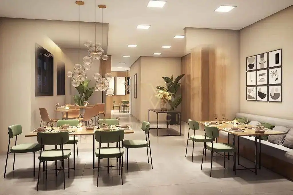 Apartamento a partir de 33m² distribuídos por sala ampla para dois ambientes, cozinha, 2 dormitórios, 1 banheiro social, área de serviço e sem vaga de garagem.