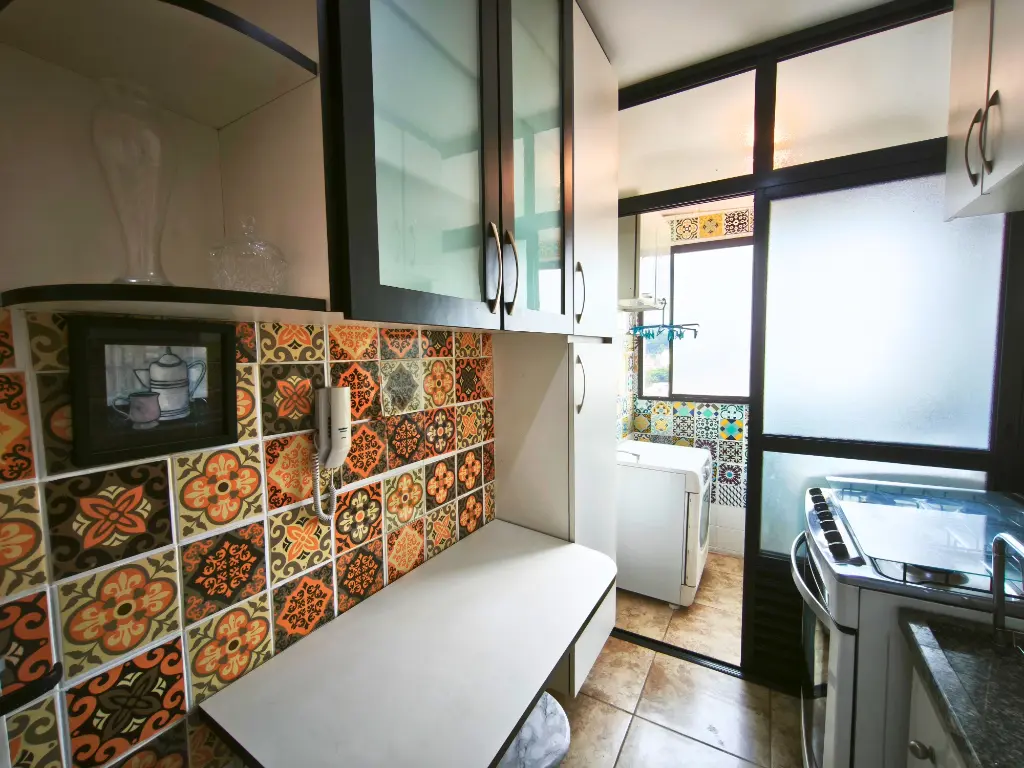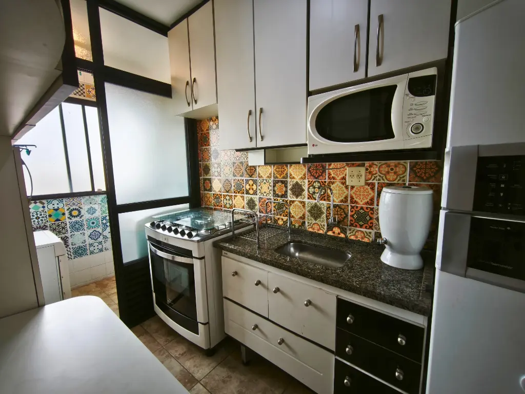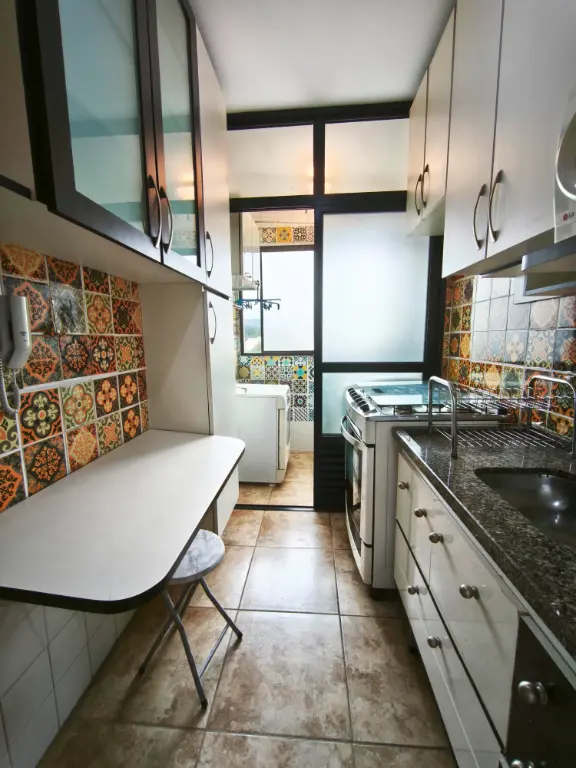 Cozinha toda planejada com fiogão 6 bocas Brastemp, microondas da marca LG e geladeira Consul - Lavaderia com máquina de secar roupa Brastemp.