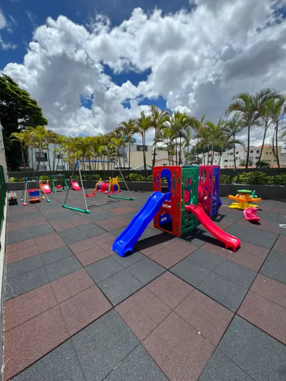 Lazer do condomínio com ampla área verde, salão de festas, quadra poliesportiva, playgroundormitórios