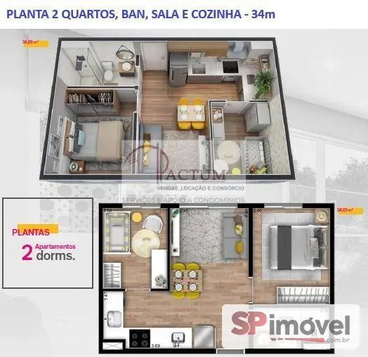 - 2 Dormitórios- Área Útil: 34,00 m²- Vaga: para Moto