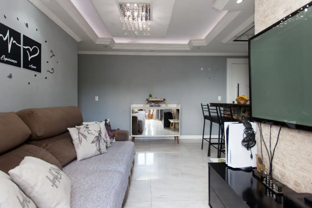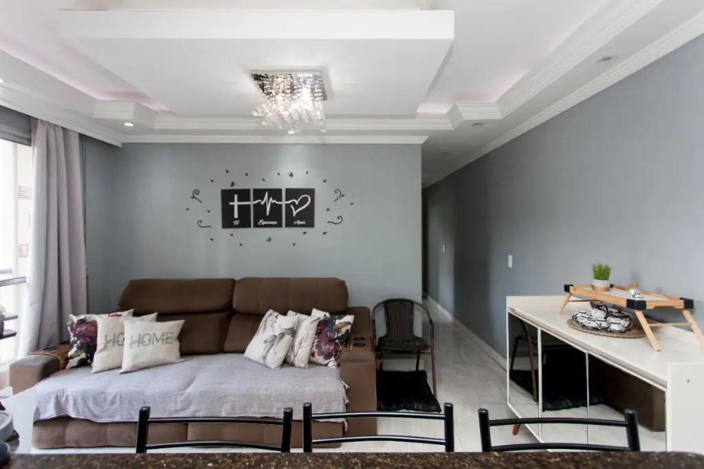 Ambientes bem distribuídos e repletos de praticidade: sala com teto em gesso, cozinha americana planejada e equipada com cooktop e forno, além de móveis sob medida nos quartos e lavanderia.