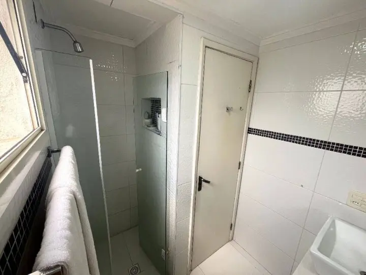 Banheiros completos, com box de vidro e chuveiro elétrico instalados