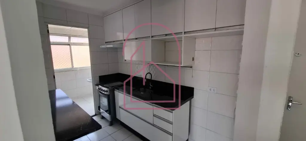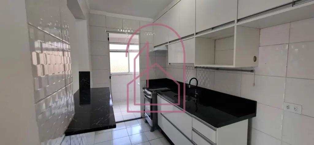 A sala é ampla para dois ambientes, bem iluminada, com lustres já instalados, integrada à cozinha americana, toda em azulejo branco, equipada com armários planejados e fogão.