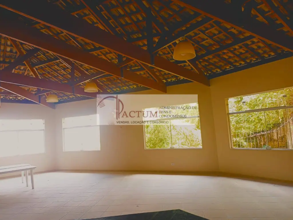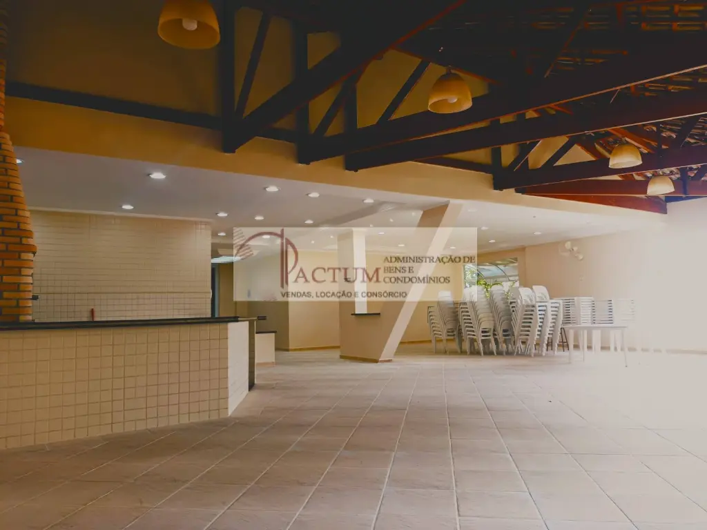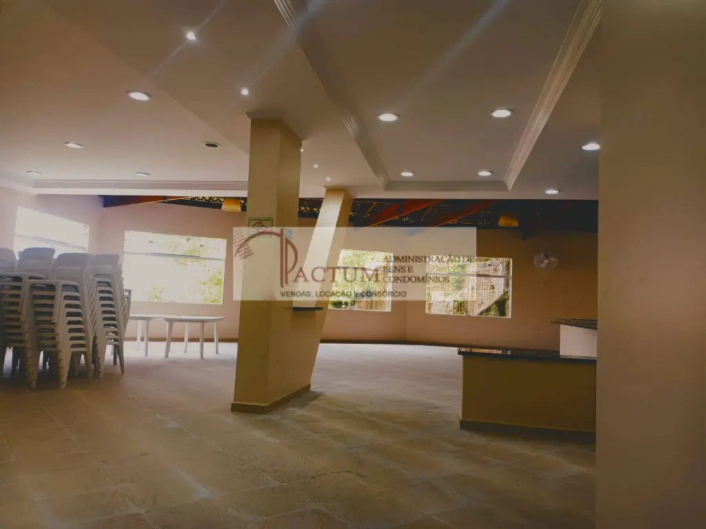 Salão de festas amplo com churrasqueira e cozinha