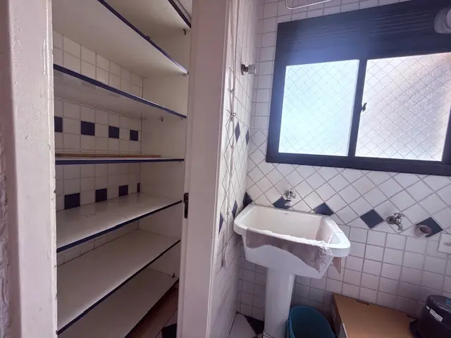 A cozinha é funcional e equipada com móveis planejados, otimizando o espaço e facilitando o dia a dia. Ao lado, a área de serviço é bem organizada, com despensa para armazenamento adicional e aquecedor a gás, trazendo mais eficiência e conforto para o imóvel.