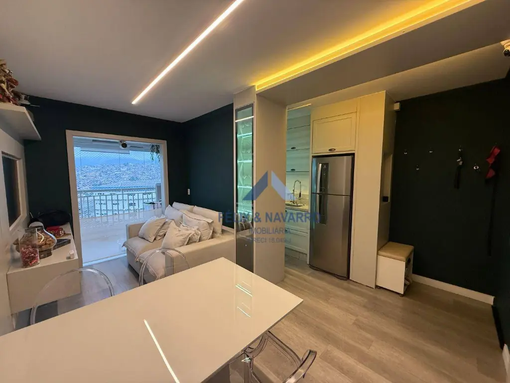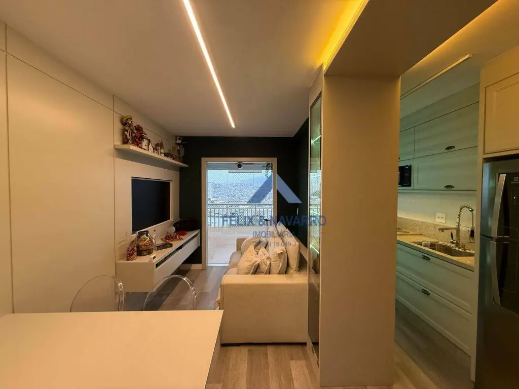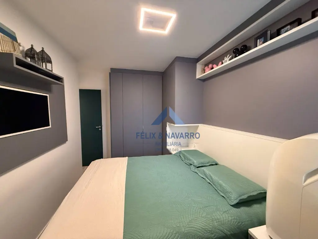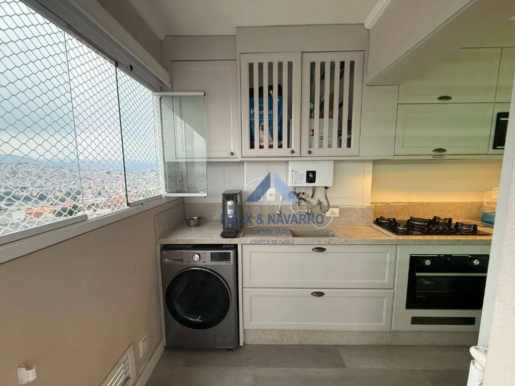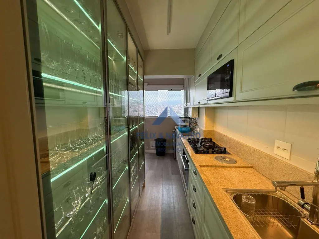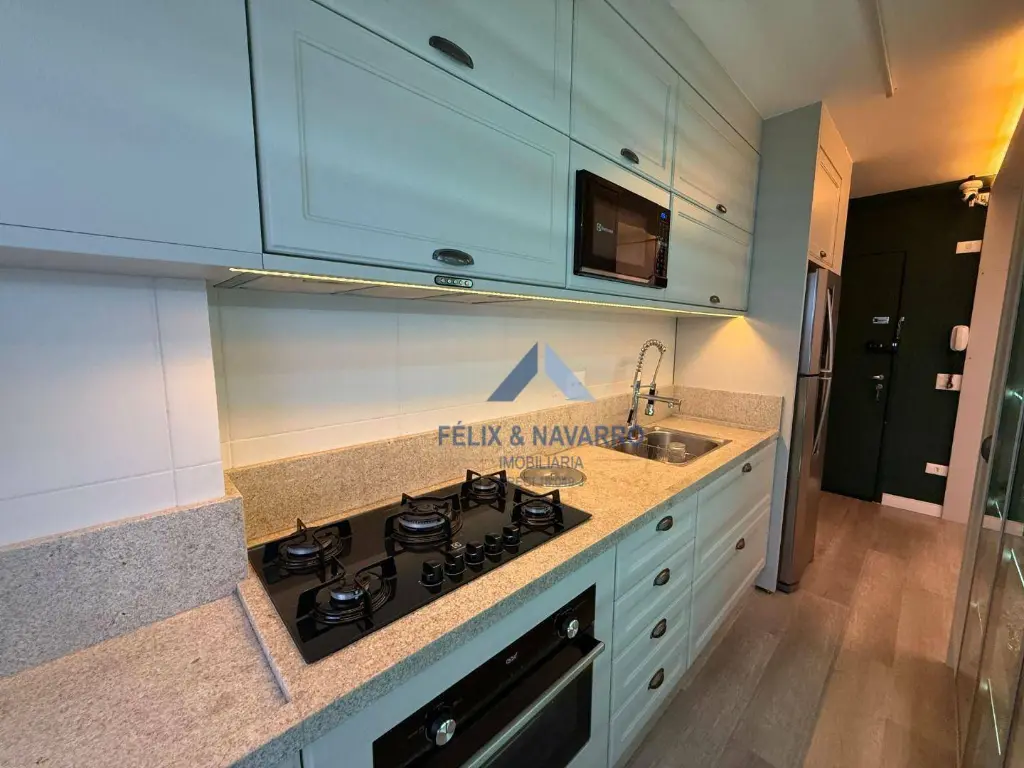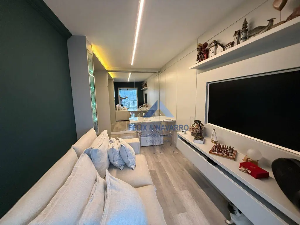 São 57 m², sendo 02 dormitórios com armários (1 suíte), sala 2 ambientes (com painel, mesa, TV frame, projetor), varanda integrada (com fechamento de vidro), cozinha americana (repleta de armários, forno, cooktop, depurador, microondas e geladeira), lavanderia (com lava e seca) e 1 vaga de garagem coberta.