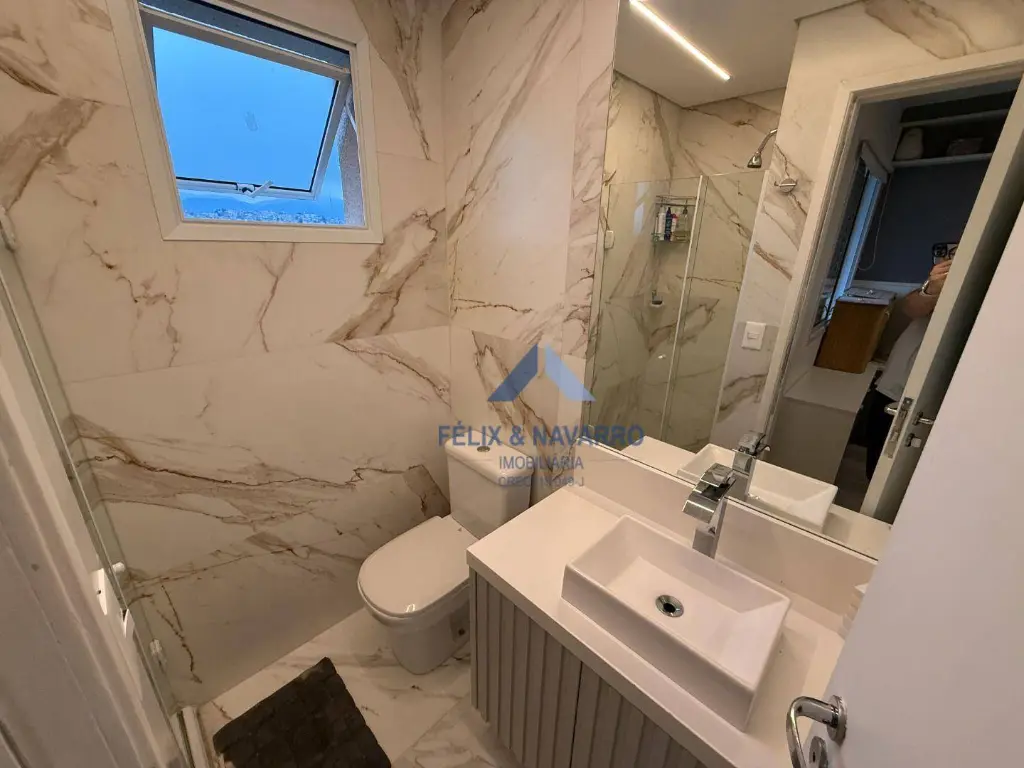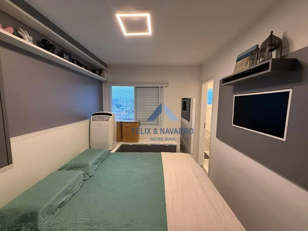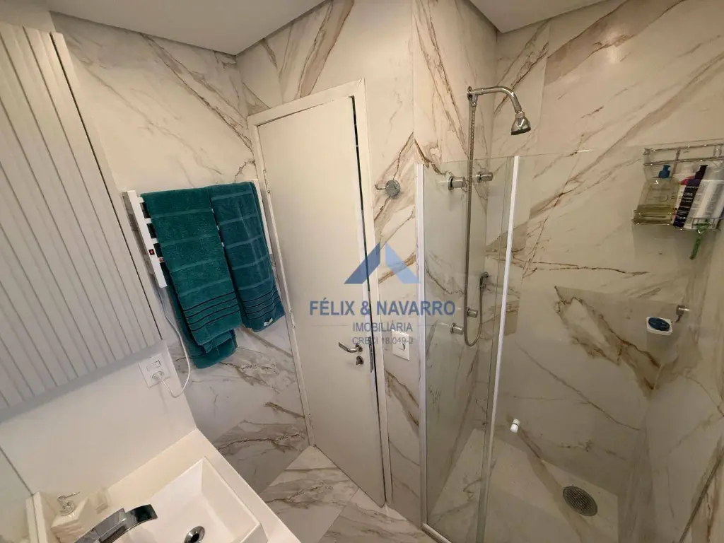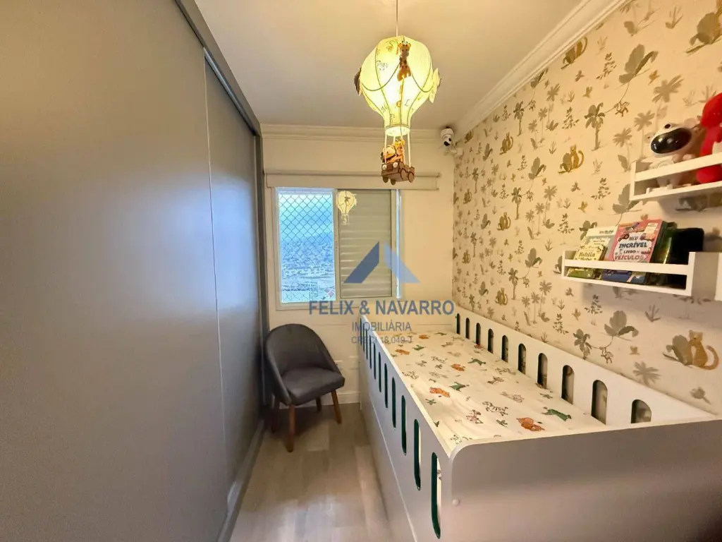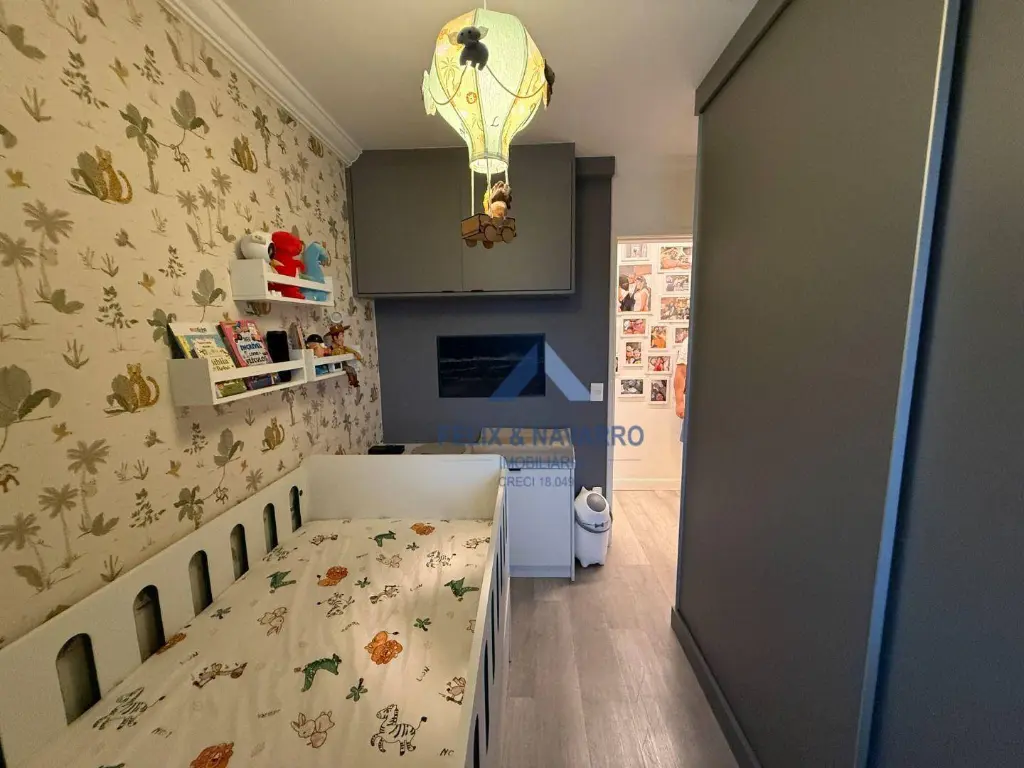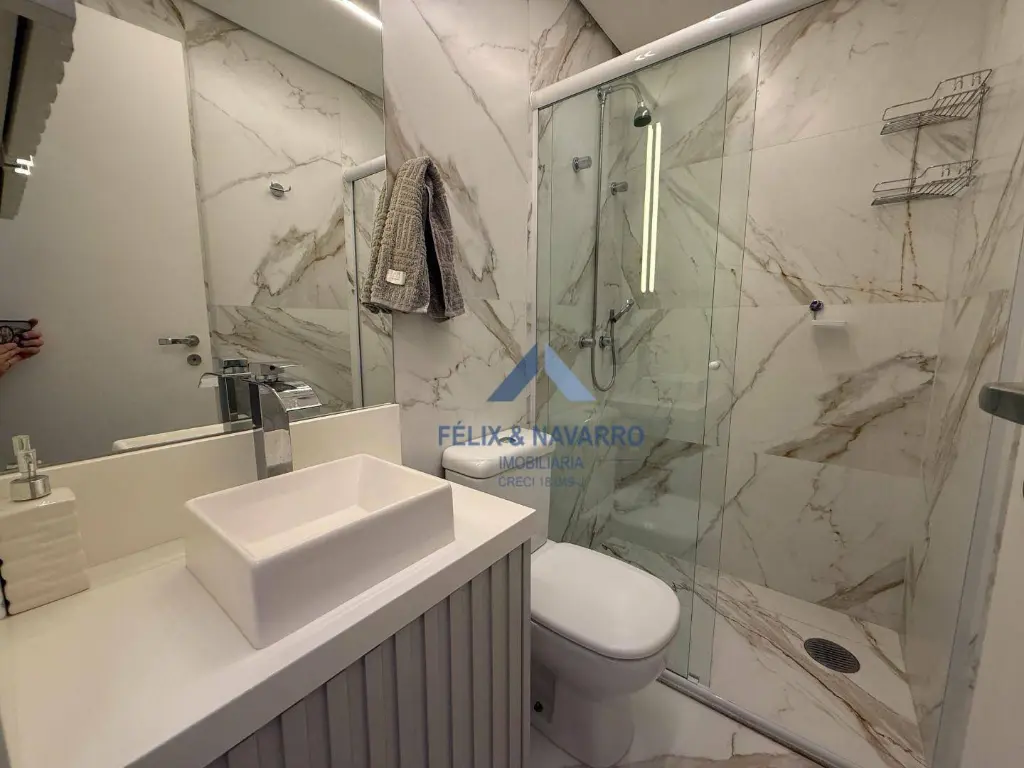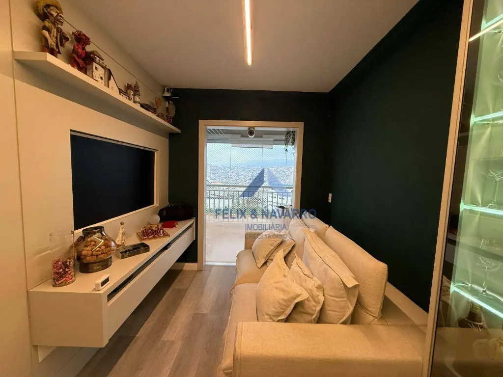 São 57 m², sendo 02 dormitórios com armários (1 suíte), sala 2 ambientes (com painel, mesa, TV frame, projetor), varanda integrada (com fechamento de vidro), cozinha americana (repleta de armários, forno, cooktop, depurador, microondas e geladeira), lavanderia (com lava e seca) e 1 vaga de garagem coberta.