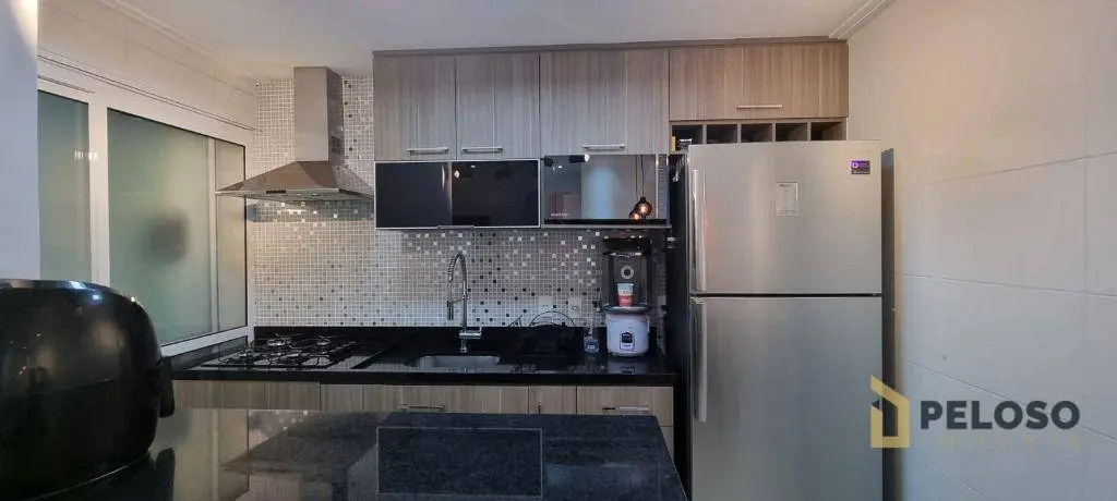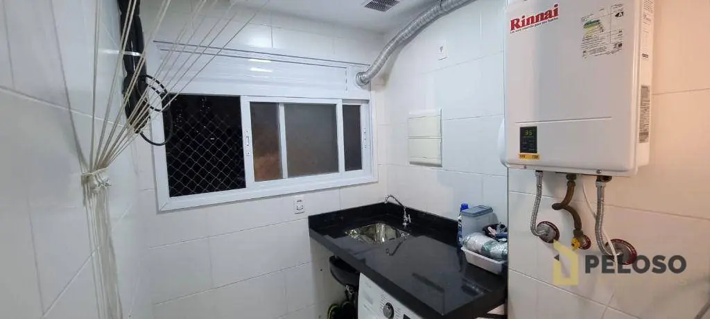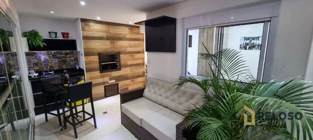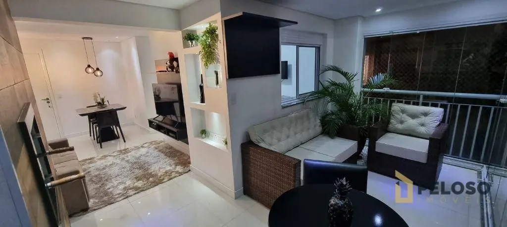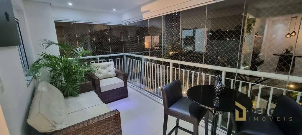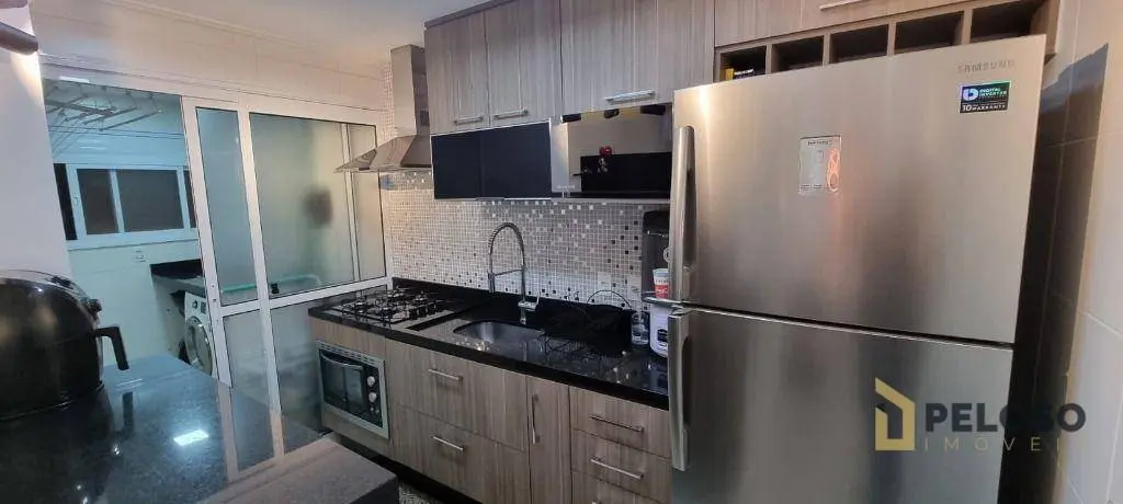2 dormitórios com armários sendo 1 suíte, banheiro social, sala para 2 ambientes integrando varanda gourmet com fechamento em vidro, cozinha americana equipada com coifa, cooktop, forno e armários, área de serviço e 1 vaga de garagem.