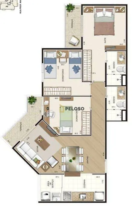 3 dormitórios sendo 1 suíte, sala para dois ambientes, 2 sacadas, cozinha, área de serviço e 2 vagas de garagem.