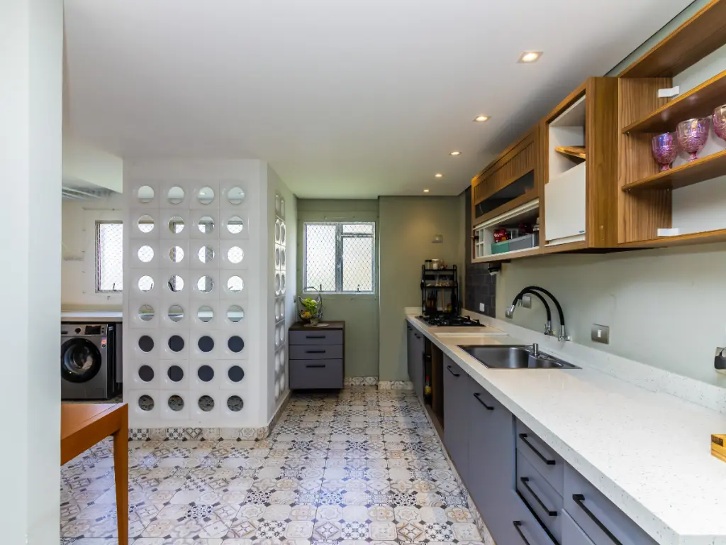 A cozinha, ampla e muito funcional, apresenta uma bancada extensa que favorece a organização e o preparo das refeições, além de oferecer excelente espaço para armazenamento. O ambiente é ideal para quem gosta de cozinhar e busca praticidade no dia a dia. Anexa à cozinha, a área de serviço é bem ventilada e bem distribuída, garantindo discrição e eficiência nas tarefas domésticas.